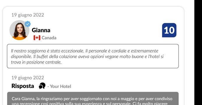 ci auguriamo che il tuo soggiorno presso [nome dell’hotel] sia stato di tuo gradimento. Ci impegniamo affinché tutti i nostri ospiti vivano una bella esperienza, per questo ci fa sempre piacere ricevere un feedback da chi ha soggiornato da noi.