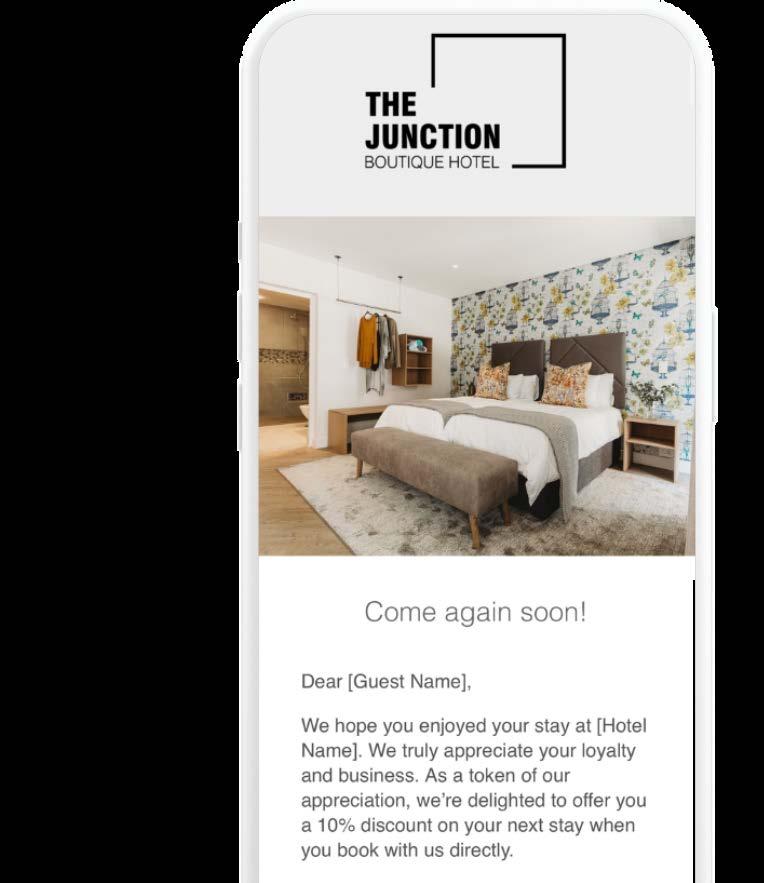 We hope you enjoyed your stay at [Hotel Name]. We truly appreciate your loyalty and business. As a token of our appreciation, we’re delighted to offer you a 10% discount on your next stay when you book with us directly.