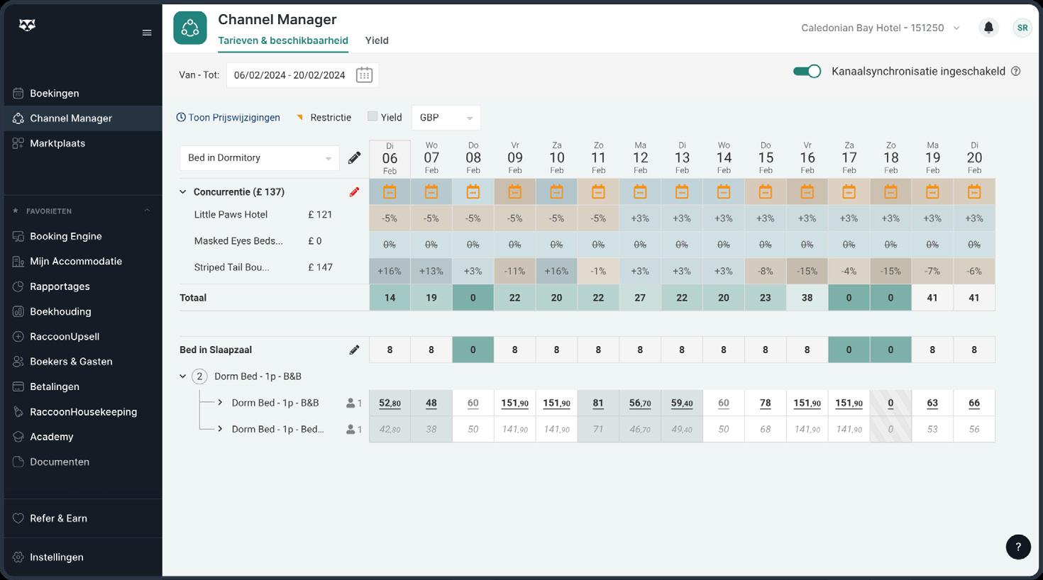 Verhoog je kamerinkomsten met behulp van yield management op basis van de concurrentie. Zorg ervoor dat je je kamers tegen de optimale prijs en op het juiste moment aanbiedt met de geavanceerde yield management functies van RoomRaccoon. RaccoonRev, onze tool voor concurrentieanalyse, speelt in op beschikbaarheid, timing en de tarieven van kamers van je concurrenten, zodat je in staat bent weloverwogen beslissingen te nemen en een betere prijsstrategie te implementeren.