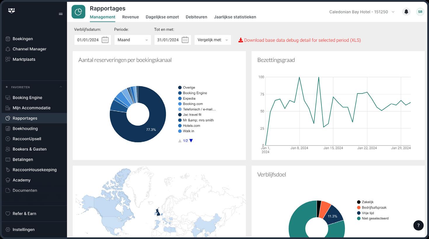 Ontvang actuele gegevens over je bedrijf met RaccoonReporting, onze rapportage module voor hotels. Bekijk de belangrijkste prestatiecijfers in een duidelijke visuele lay-out - geen berekeningen nodig! Voor onze Premium en Enterprise gebruikers bieden we geavanceerde rapporten die uitgebreide gegevens over de omzet bieden, zodat de werkelijke omzet altijd vergeleken kan worden met de doelstelling. Deze rapporten bevatten jaar-op-jaar rapporten en werkelijke versus budget rapporten.