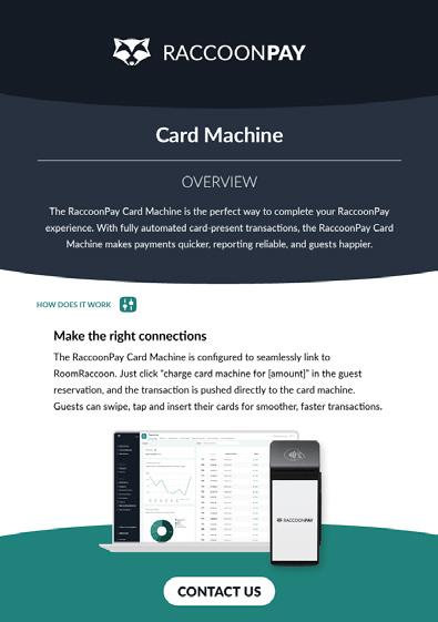 Veilig, naadloos en slim: RaccoonPay is ons volledig geïntegreerde alles-in-één betalingssysteem. Het betalingssysteem van RoomRaccoon maakt gebruik van automatisering en 3D-beveiliging om al je transacties te verwerken, waardoor je onmiddellijk tijd en kosten bespaart.