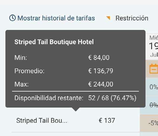 Los datos se actualizan cada mañana; los distintos colores marrones indican un porcentaje de bajada de precios ylos tonos azules, un aumento. La competencia por las reservas con otros establecimientos de tu zona geográfica es continua, por eso, el análisis de tu ComptSet debe ser una parte fundamental de tu estrategia de negocio.