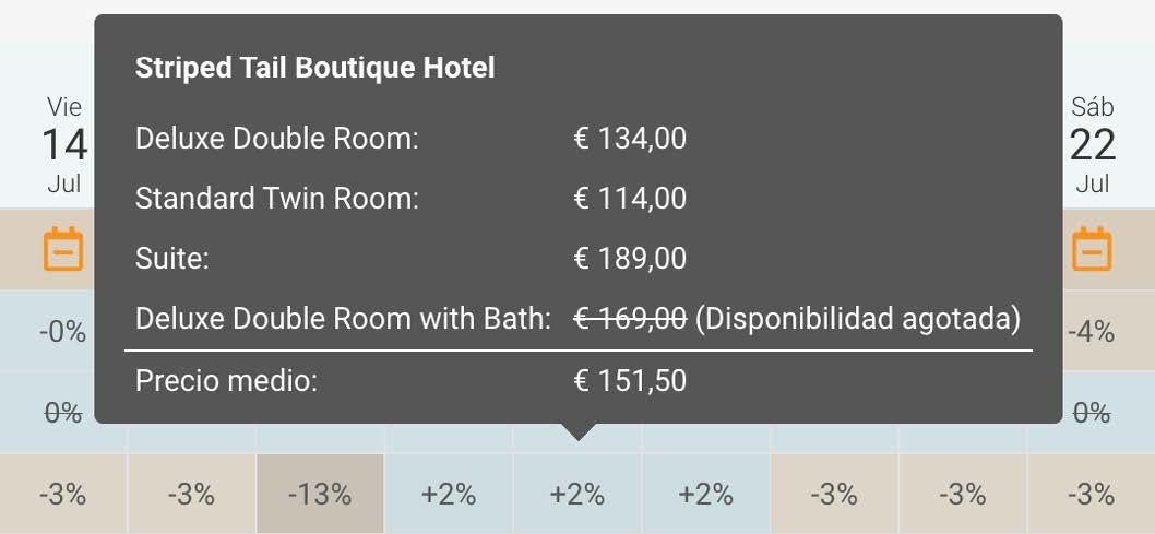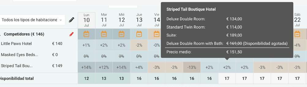 Descubre las distintas categorías de habitaciones de tus competidores; desde el coste medio por un tipo de habitación hasta su disponibilidad (agotadas o no).