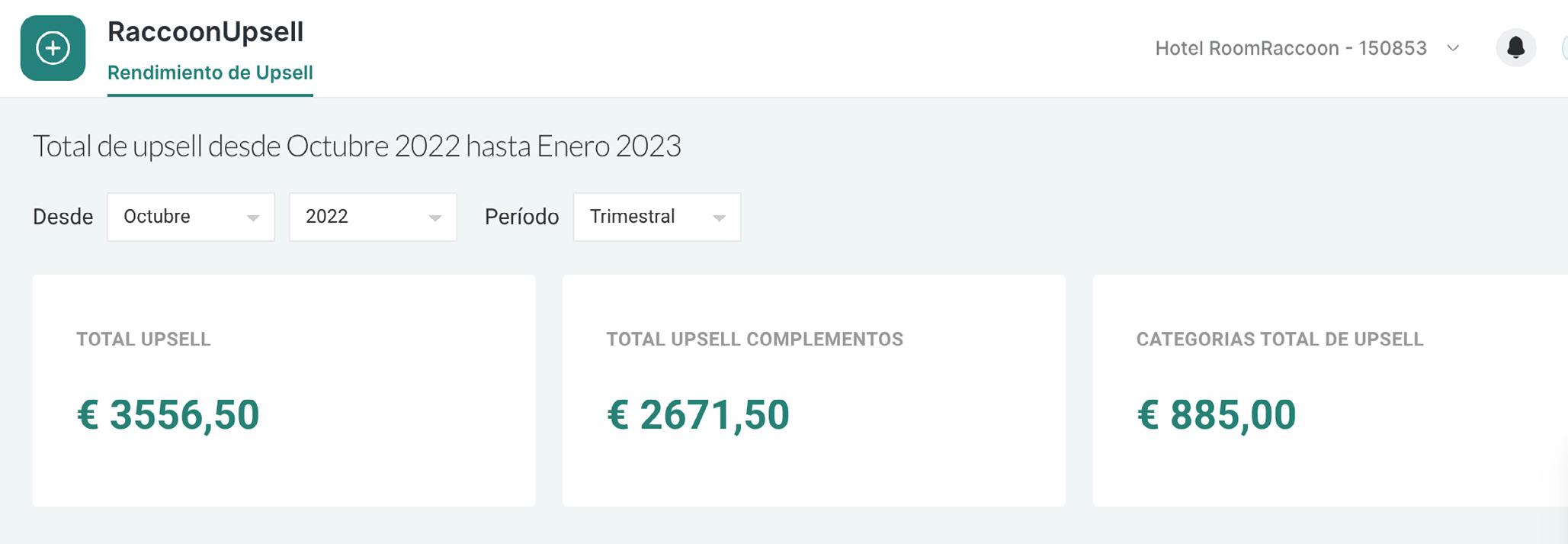 Los informes de RaccoonUpsell proporcionan una visión general de todos los complementos y categorías de habitación vendidos durante un periodo específico. Puedes filtrar los datos por mes, trimestre, año o periodo completo. En el siguiente ejemplo te mostramos la cantidad total de upselling capturada durante un mes (de enero a febrero).