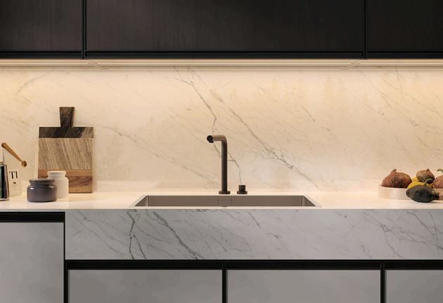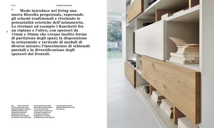 ZATAESEI Zataeseiowesitsnameto thespecialloweredskirting board.Thisinnovationisnot onlyaesthetic,the6cm skirtingboardprovidesmany practicalbenefits,including increasedvolume,increased depth,andtheavailabilityto addasecondshelfper78cm highbases.Zataeseiis enhancedbyfurnishing accessoriesthatconnect kitchenandlivingroom,as wellasbyfinefinishes