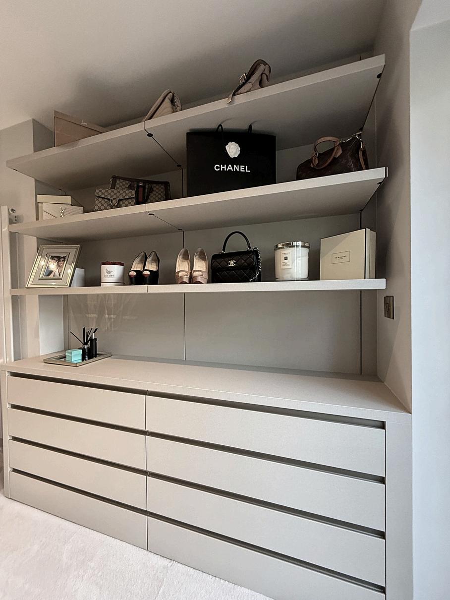 Our walk in wardrobes include a variety of collections which offer different aesthetics. Bellavista creates a free standing look, with the choice of wooden, glass or metal framed sides, while the panorama offers a more simplistic look with less structure. Many accessories are available for these collections. The layout can be tailored entirely to your requirements. Whether it is a matching central island, or finer details, such as leather jewellery trays. We can cover everything from shoe storage to sock draws.