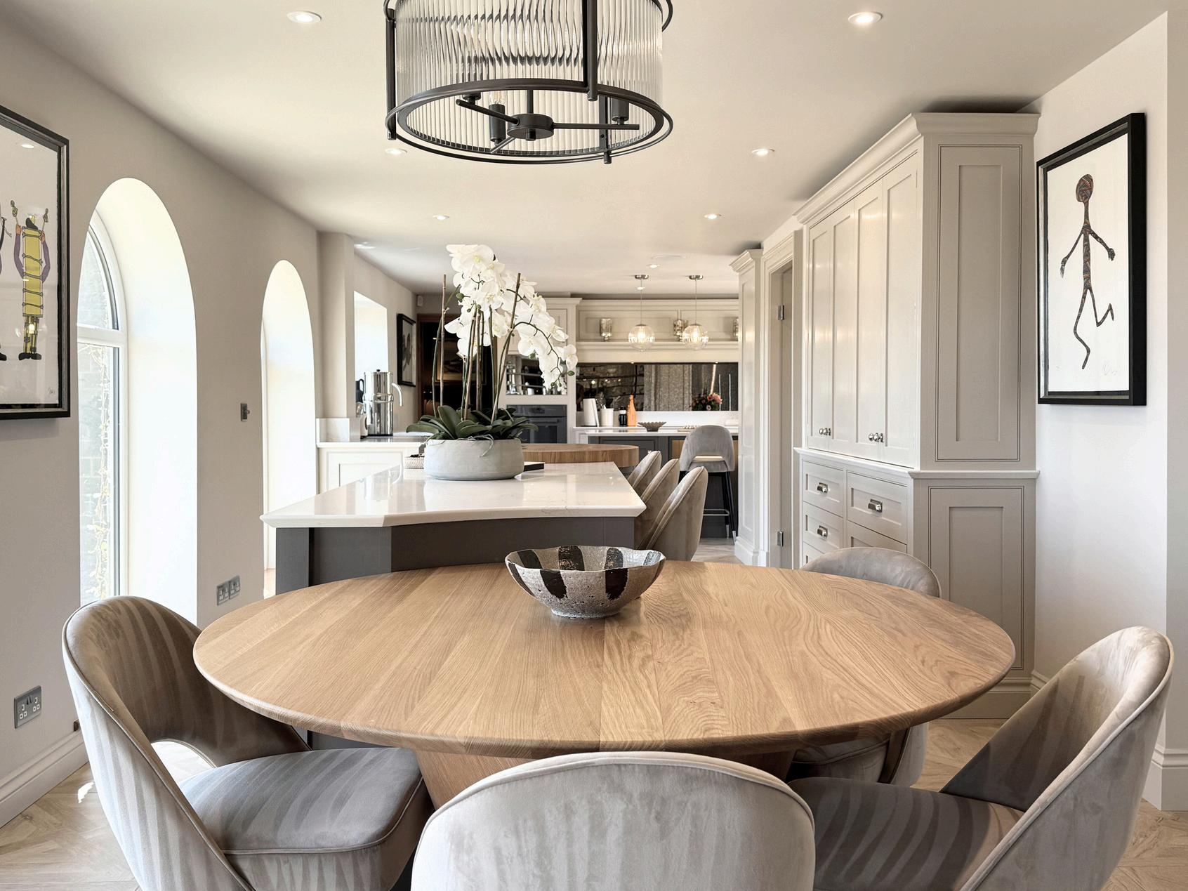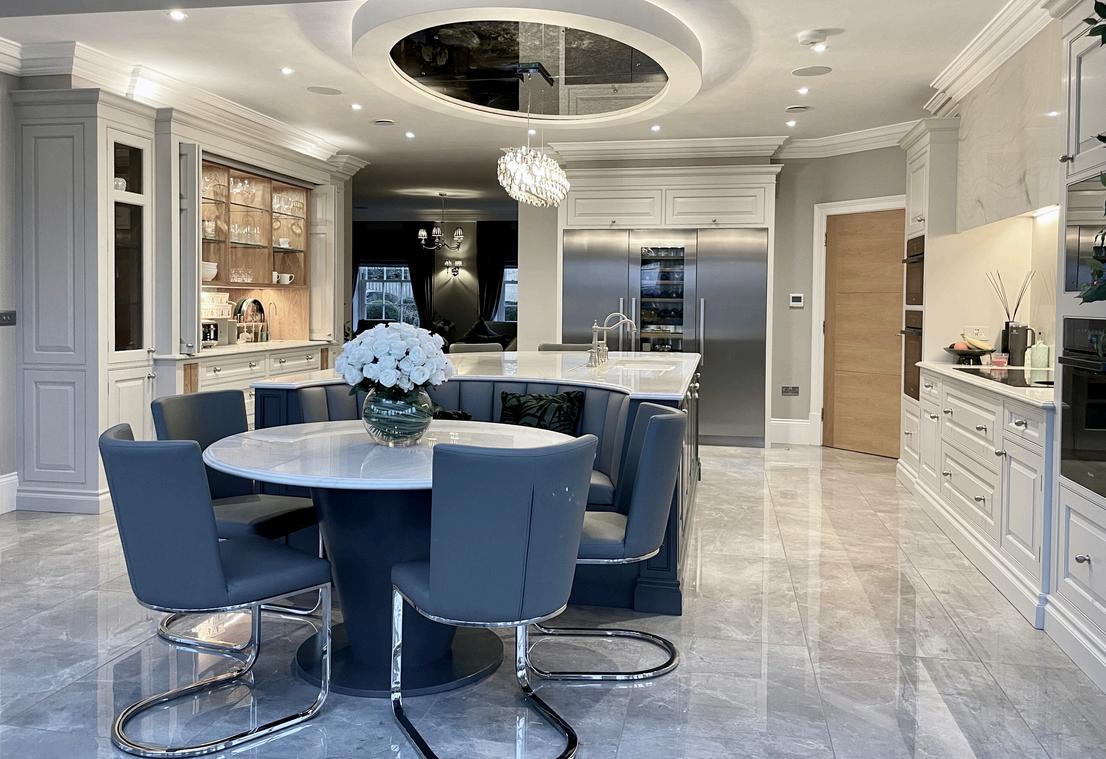 HAREWOOD Handmadekitchenwithraised&fielded ovalshoulderdoorandskirtingplinth Talltraditionalcovingandcorniceare usedtoaddeleganceandcharacterto thespaceFeaturebifold,pocketdoor doublelarderwithwoodeninternals andintegratedLEDlightingThe perfectsolutiontohideaway applianceskeepingthekitchenclean andminimalisticLargebanquette facingtheglassorangeryUpholstered flutedback,tableonStainlesssteel basewithCalacattaBraziltop