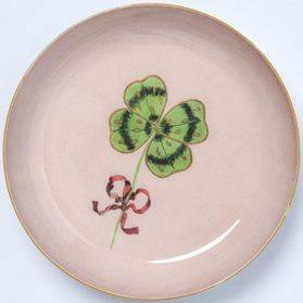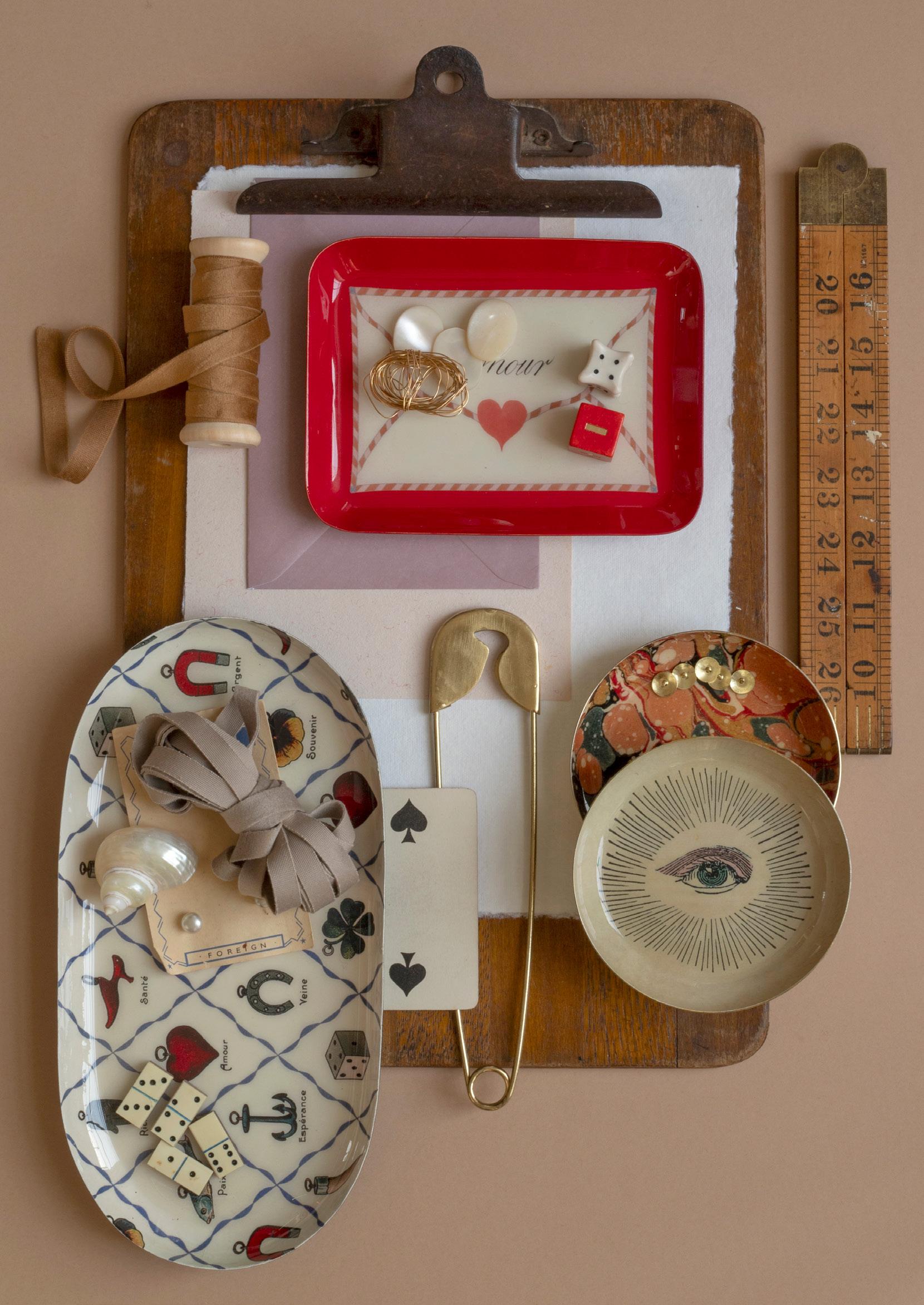 Symbolic vintage illustrations — a clover, an all-seeing eye, a love letter — restored and translated into lovely trays.