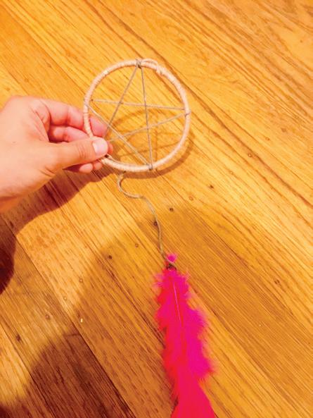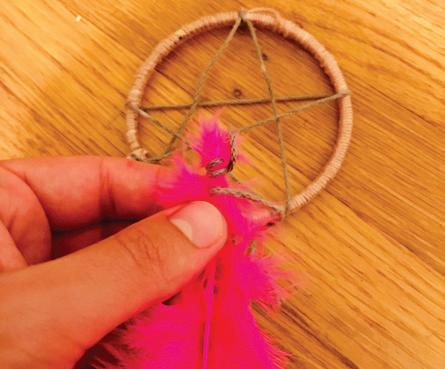 Para terminar, escoja una pluma que le guste Y corte una lana de 3 a 6 pulgadas. Después, con la lana, amarre un nudo alrededor de un punto del círculo. Con el otro extremo de la lana, vaya al rededor de la punta de la pluma 5 veces y luego ate un nudo muy fuerte.