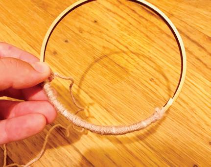 Después del proceso de teñido, corte una tira larga de lana y empiece a cubrir el círculo enrollando la lana alrededor hasta que no se vea la madera.