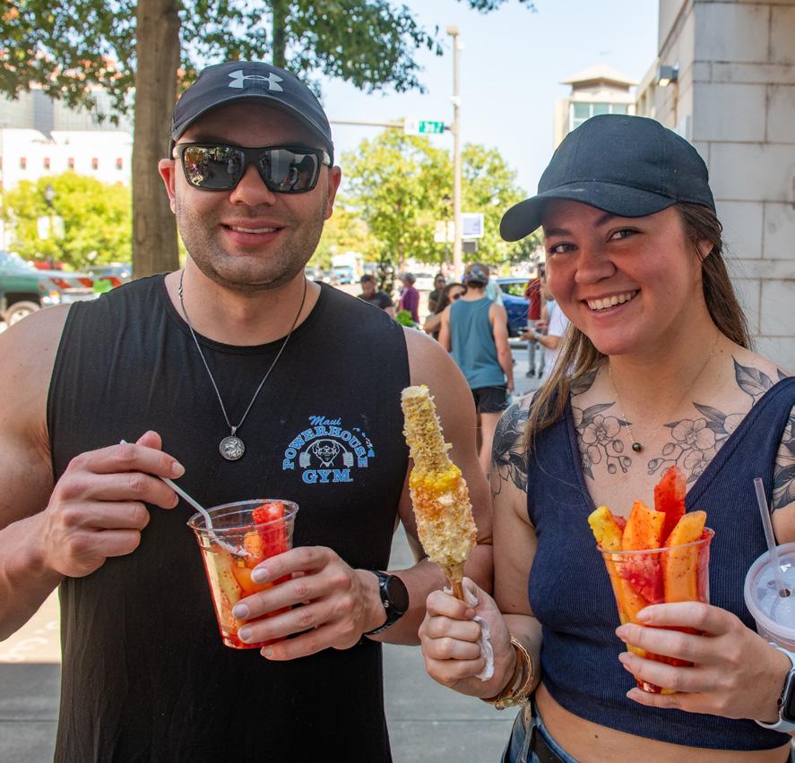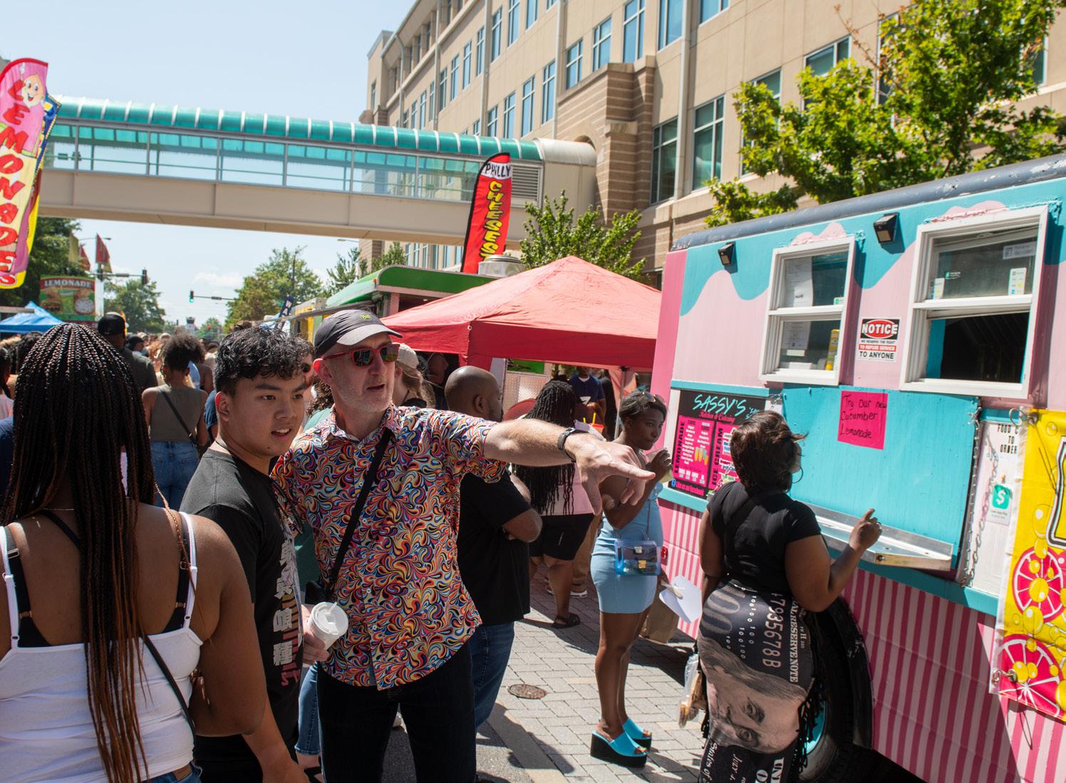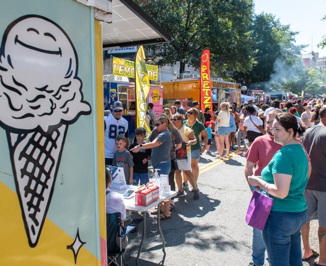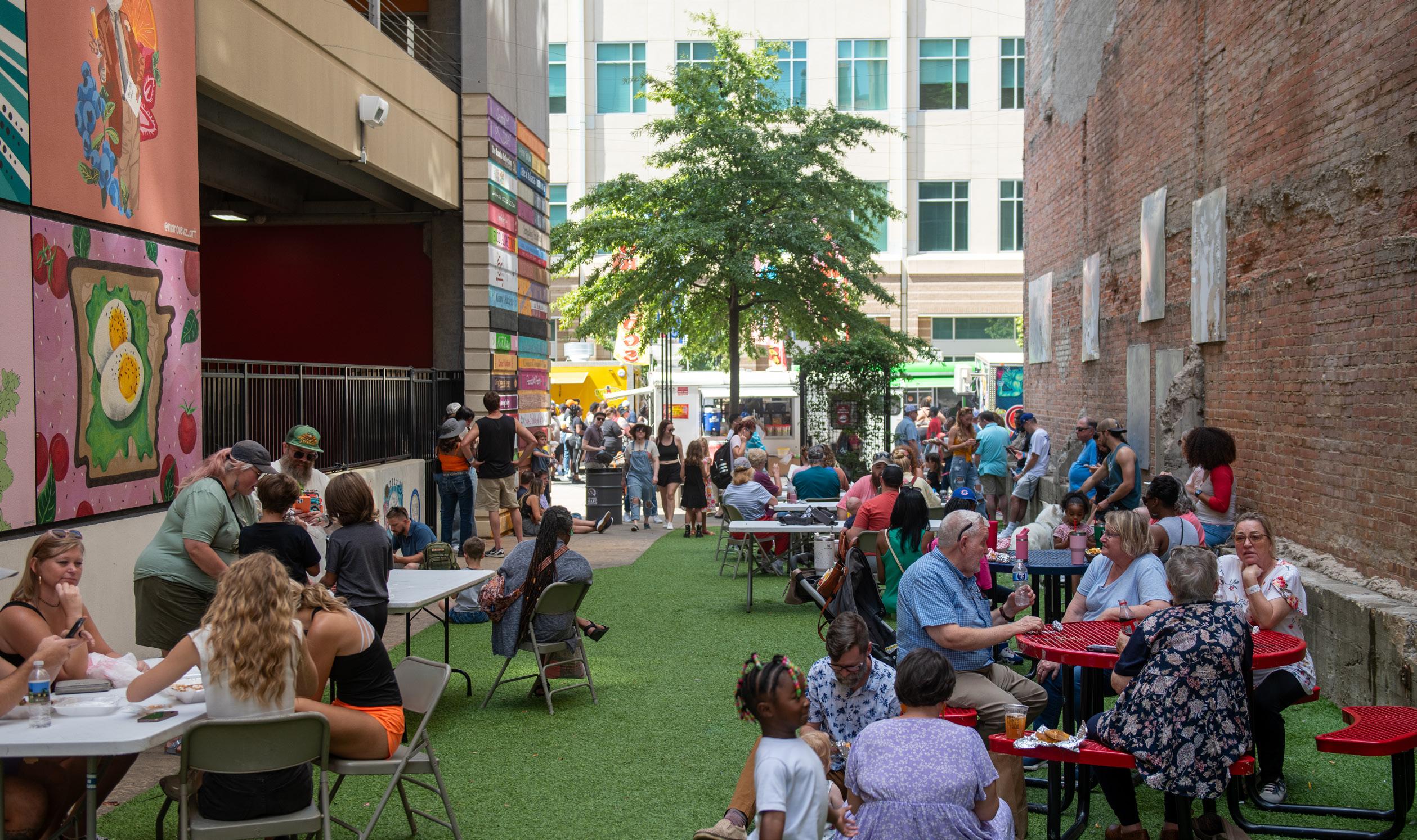 Festivalgoers dine in the pocket park during the 2023 Main Street Food Truck Festival.