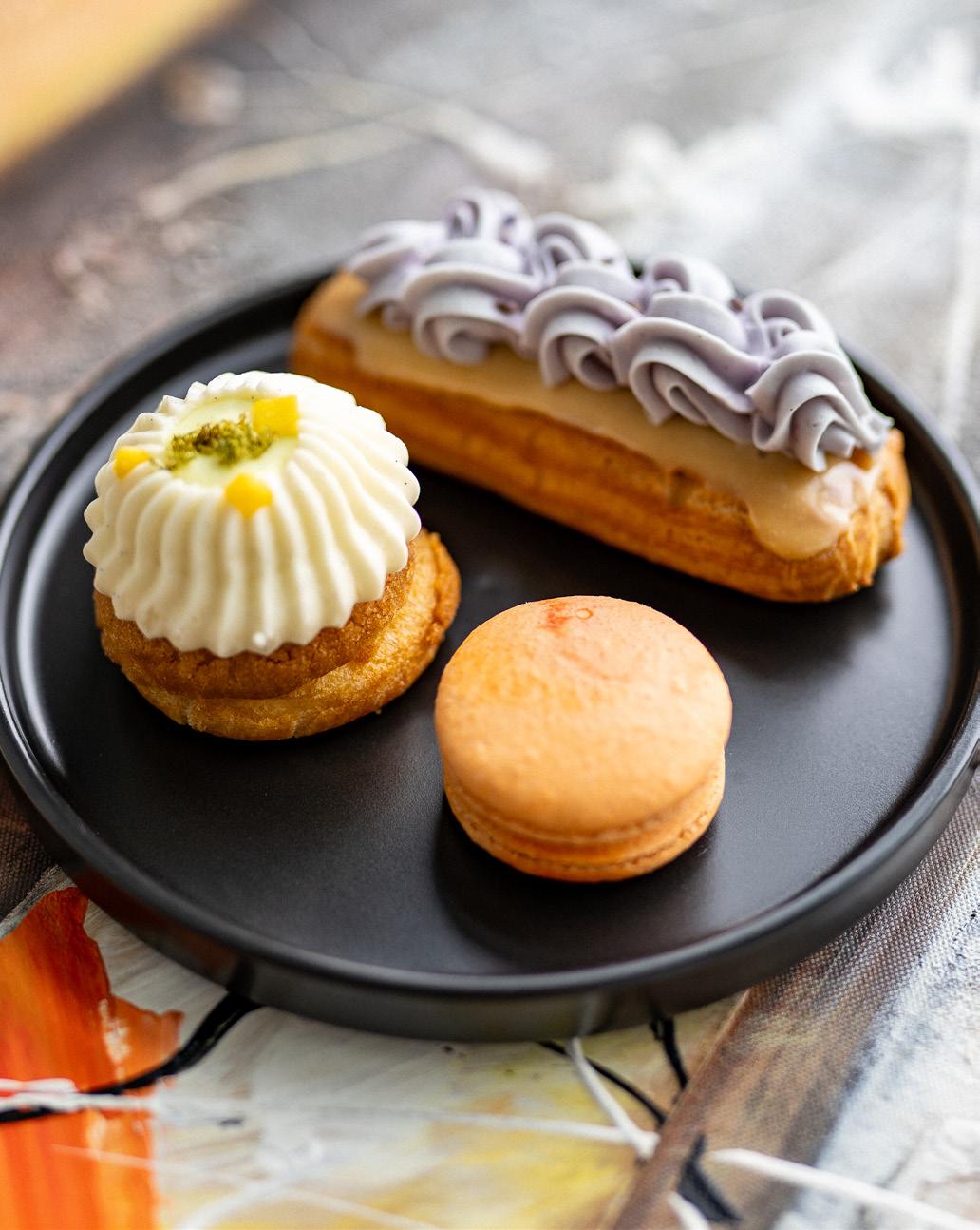 A trio of treats from Butter/ Scotch Bakery & Bar, including (clockwise from top): a London Fog eclair, Thai tea macaron, and mango-lime choux bun.