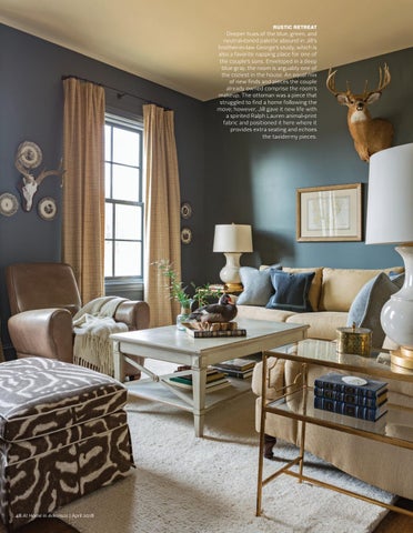 Deeper hues of the blue, green, and neutral-toned palette abound in Jill’s brother-in-law George’s study, which is also a favorite napping place for one of the couple’s sons. Enveloped in a deep blue gray, the room is arguably one of the coziest in the house. An equal mix of new finds and pieces the couple already owned comprise the room’s makeup. The ottoman was a piece that struggled to find a home following the move; however, Jill gave it new life with a spirited Ralph Lauren animal-print fabric and positioned it here where it provides extra seating and echoes the taxidermy pieces.