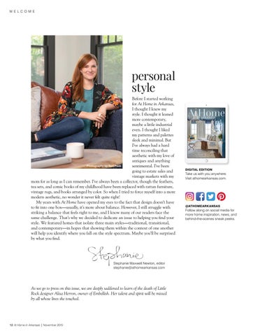 personal style Before I started working for At Home in Arkansas, I thought I knew my style. I thought it leaned more contemporary, maybe a little industrial even. I thought I liked my patterns and palettes sleek and minimal. But I’ve always had a hard time reconciling that aesthetic with my love of antiques and anything Photography by Rett Peek sentimental. I’ve been going to estate sales and vintage markets with my mom for as long as I can remember. I’ve always been a collector, though the feathers, tea sets, and comic books of my childhood have been replaced with rattan furniture, vintage rugs, and books arranged by color. So when I tried to force myself into a more modern aesthetic, no wonder it never felt quite right! My years with At Home have opened my eyes to the fact that design doesn’t have to fit into one box—usually, it’s more about balance. However, I still struggle with striking a balance that feels right to me, and I know many of our readers face the same challenge. That’s why we decided to dedicate an issue to helping you find your style. We featured homes that isolate three main styles—traditional, transitional, and contemporary—in hopes that showing them within the context of one another will help you identify where you fall on the style spectrum. Maybe you’ll be surprised by what you find.