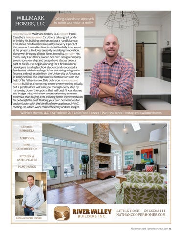 in limiting his building projects to just a handful a year. This allows him to maintain quality in every aspect of the process from attention-to-detail to daily time spent at his projects. He loves creativity and design innovation, along with bringing clients’ ideas to reality. history: His mom, Judy Caruthers, owned her own design company so entrepreneurship and design have always been a part of his life. He began working for a few builders/ developers as a high school student and renovated a few homes while in college. After obtaining a degree in finance and real estate from the University of Arkansas in 2005 he took the leap to new construction with the help of his father-in-law, Dale Johnson. homebuilding advice: Building a home may seem overwhelming initially, but a good builder will walk you through every step by narrowing down the options that will best fit your desires and budget. Also, while new construction may be more expensive than buying a pre-existing home the rewards can far outweigh the cost. Building your own home allows for customization with the benefit of new appliances, HVAC, roofing, etc. which work more efficiently and last longer. WillMark Homes, LLC • 14 Paddock Ct. • Little Rock • 72223 • (501) 350-0700 • Instagram: @willmarkhomes