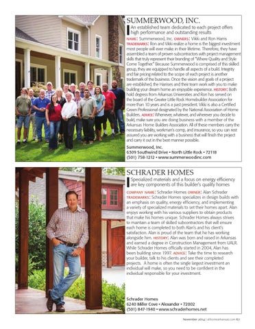 most people will ever make in their lifetime. Therefore, they have assembled a team of proven subcontractors with project management skills that truly represent their branding of “Where Quality and Style Come Together.” Because Summerwood is comprised of this skilled group, they are equipped to handle all aspects of a build. Integrity and fair pricing related to the scope of each project is another trademark of the business. Once the vision and goals of a project are established, the Harrises and their team work with you to make building your dream home an enjoyable experience. history: Both hold degress from Arkansas Universities and Ron has served on the board of the Greater Little Rock Homebuilder Association for more than 10 years and is a past president. Vikki is also a Certified Green Professional designated by the National Association of Home Builders. advice: Whenever, whatever, and wherever you decide to build, make sure you are doing business with a member of the Arkansas Home Builders Association. All of these members carry the necessary liability, workman’s comp, and insurance, so you can rest assured you are working with a business that will finish the project and carry it out in the best manner possible. Summerwood, Inc. 6309 Southwind Drive • North Little Rock • 72118 (501) 758-1212 • www.summerwoodinc.com