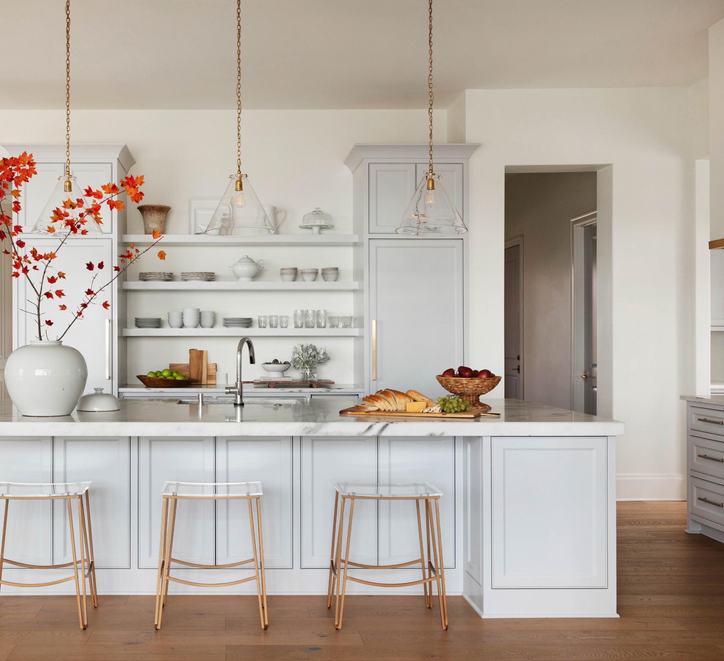 One constant throughout each of the Parkinsons’ homes has been an open-concept floor plan, which allows for easy entertaining and, in this house in particular, sweeping views. The streamlined design continues in the kitchen where they opted to forgo upper cabinetry. “I have a ton of storage in the island, and open shelving holds our everyday plates,” Jessica says. These shelves are flanked by a paneled refrigerator and pantry-style door concealing rows of drawers, smart solutions that also bring symmetry to the design.