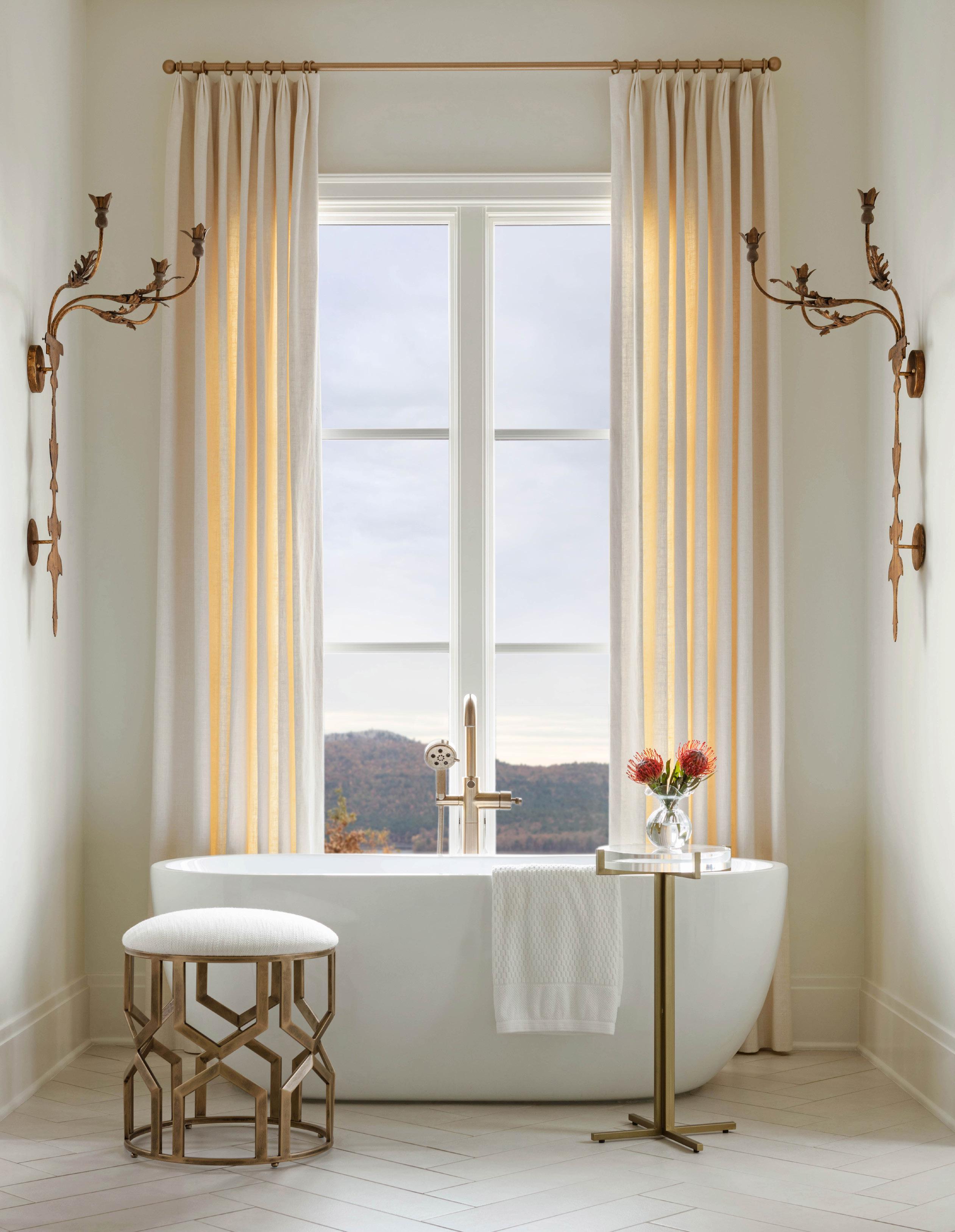 In the primary bedroom, Jessica’s directives were for it to feel light, elegant, and comfortable. Mona commissioned a custom four-poster bed by blacksmith Anthony Billingsley. “We do those for a lot of clients these days, but this was the first one; Anthony calls it the ‘Providence bed’ now,” Mona says. The bathroom is all about symmetry. A soaking tub provides the focal point between his-and-hers vanities, and a porcelain tile cut in half and laid in a herringbone pattern brings style underfoot without straying from material selections found throughout other areas of the home.
