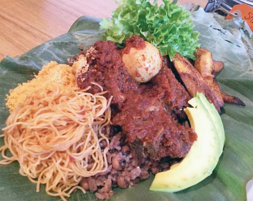 Waakye is a meal that exhibits Ghanaians’ creative use of rice. The recipe is a merger of beans and rice and originally a Northern dish. However, it can now be found almost everywhere on the streets of Ghana. Eating Waakye will open the door to a range of Ghanaian tastes and flavours as the main dish is served with other sides such boiled eggs, fried plantain, garri (grated cassava), spaghetti and avocado.