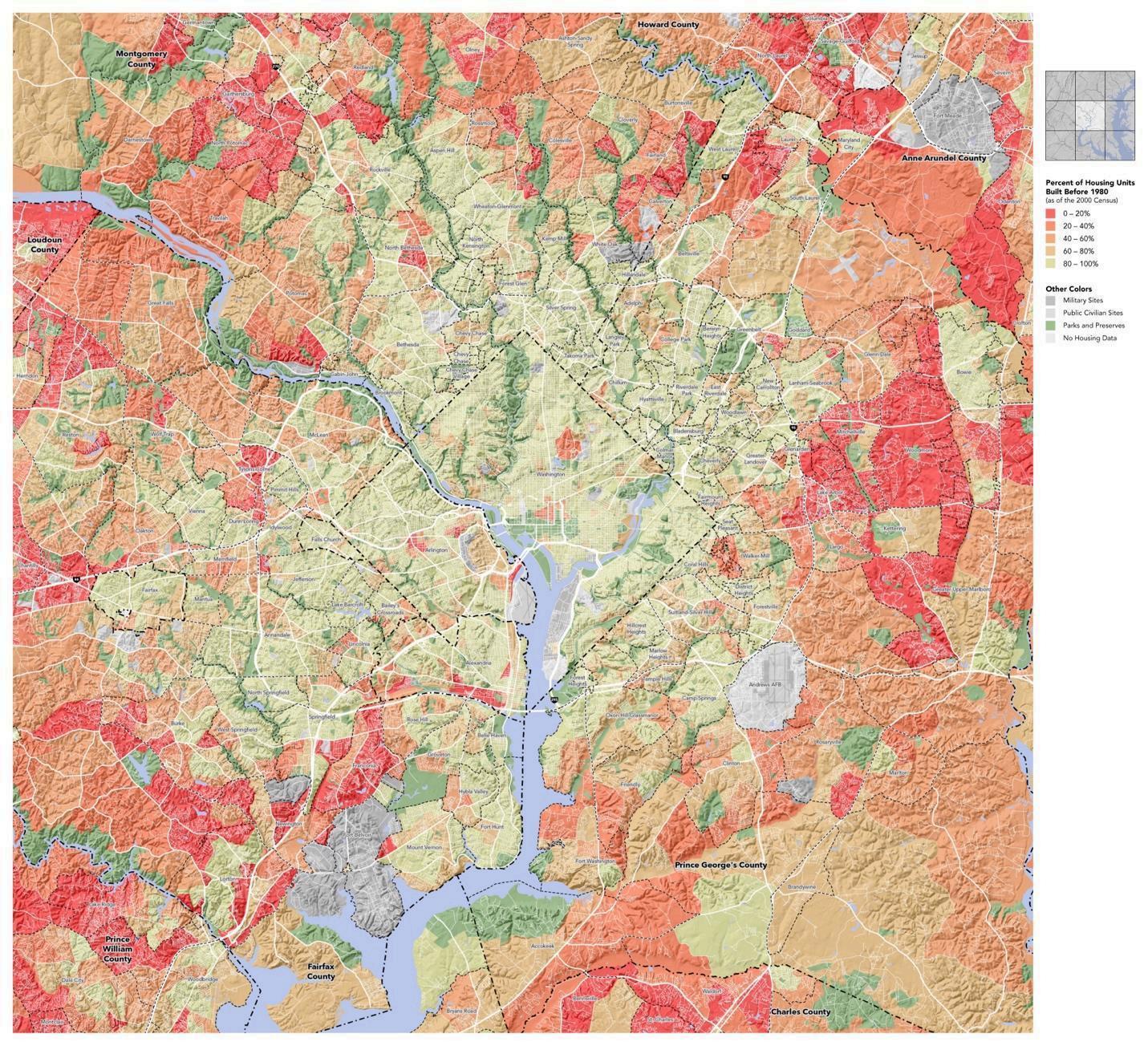 BeforeconsideringthelargermessageofRankin’smap,itisimportanttonotetheunique meritsofhisapproachtodocumentingthedevelopmentofhousingunitswithinDC’s“urban core”andthesurroundingsuburbs(Rankin2010).Themap’smoststrikingfeatureatfirstglance appearstobethecolorsthatareused;greenareasseemtocallforwardasenseofeasewhilered zonesalerttheviewertothepossibleharmfulimplicationsoftheseregions.Inthisway,Rankin isnotonlyabletoofferameaningfulvisualcharacteristictodistinguishtheage—oreven “newness”—ofhousingunitsbutcandeliveracritiqueofthenewerdevelopmentsthat potentiallyarosefromunfavorablecircumstances.Similarly,Rankin’suseofscaleandscopeis
