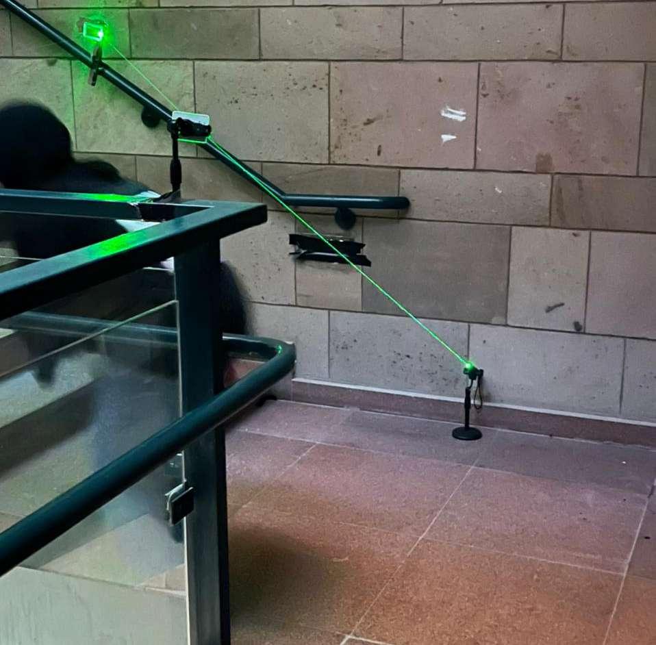 p u b l i c s e t t i n g i n S S E B u i l d i n g . Y o u a r e e x p e c t e d t o d e s i g n h o w t h e c o m p o s i t i o n i n t e r c o n n e c t s w i t h i t s s u r r o u n d i n g s p a c e a n d a r c h i t e c t u r e , a n d i n t u r n , h o w u s e r s i n t e r a c t w i t h i t t o c r e a t e a n e w s p a t i a l e x p e r i e n c e . L a s e r l i n e s f o r m a c o m p o s i t i o n t o g u a r d t h e c o v e r e d a r e a u s i n g r e f l e c t i o n s h u m a n i n t e r a c t i o n : w h e n p e o p l e c u t t h e l i n e , a n e l e c t r i c s o u n d i s p r o d u c e d B u i l d i n g i n t e r a c t i o n : S S E S t a i r s a d d i n g m o r e l i n e s c o u l d i m p r o v e t h e c o m p o s i t i o n M o d e l h a s b e e n e x e c u t e d i n a p r o f e s s i o n a l m a n n e r f u n c t i o n i n g a n d V e r y i n t e r a c t i v e