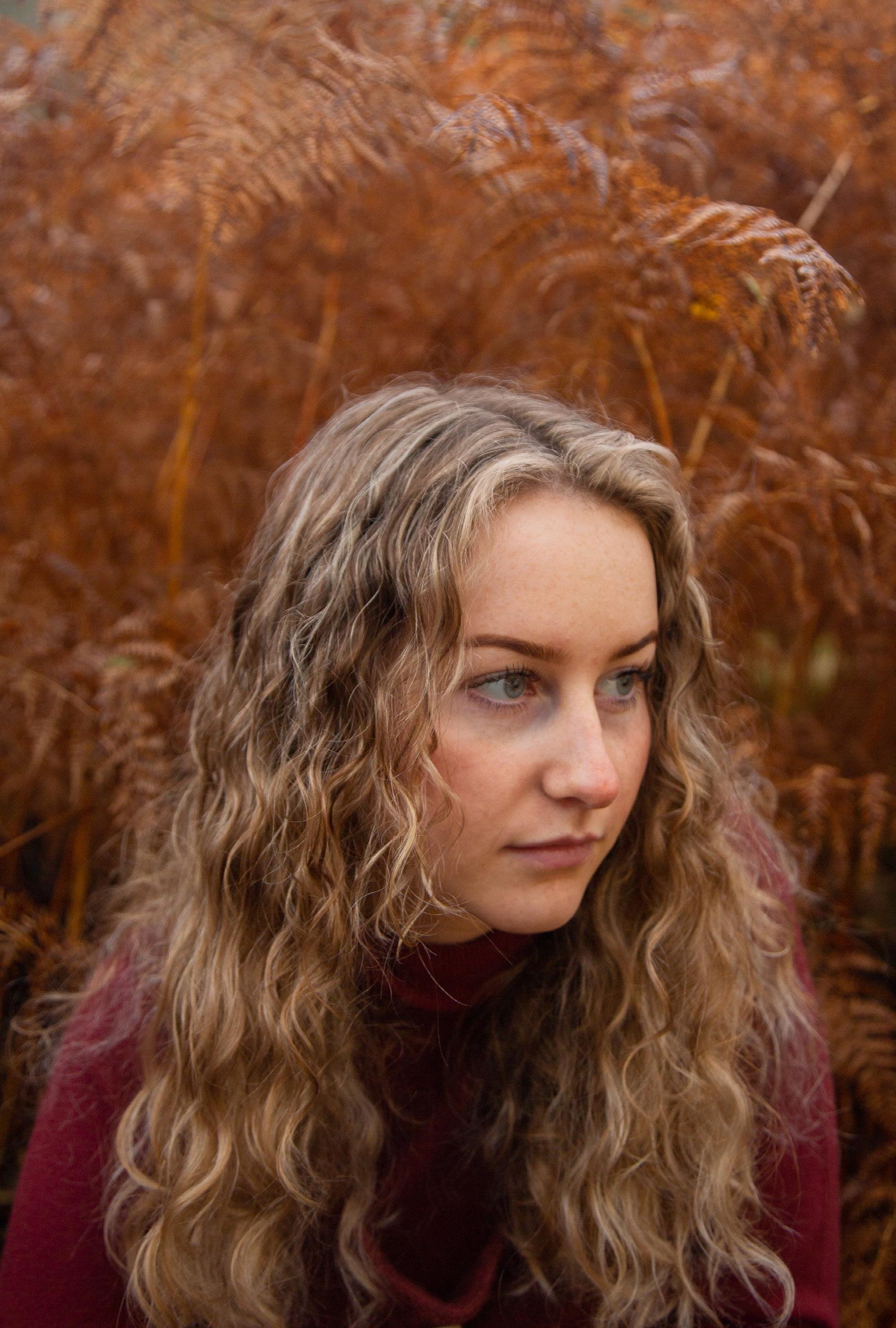 Anya wears Gran’s waistcoat and own top. Old Castle Wood, Grandtully.