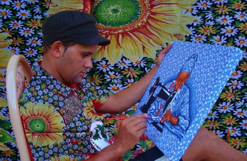 O artista plástico apresenta sua inovadora técnica de pintura em telas sobre chita estampada.