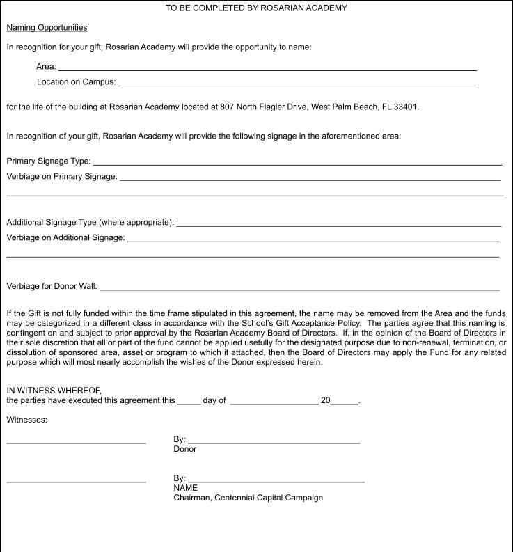 I/We, _________________________________________, the undersigned, enter into this CAPITAL CAMPAIGN AGREEMENT this day of ________________, 20___ with ROSARIAN ACADEMY, a Florida not-for-profit corporation. I/We pledge the sum of $_________________ toward the capital project for the development and redevelopment of the campus, and for all other expenses and funds associated with the new facilities and capital campaign. In consideration of the contribution, Rosarian Academy will gratefully acknowledge the gift in the following manner: __________________________________________________________________________________________________________________________.