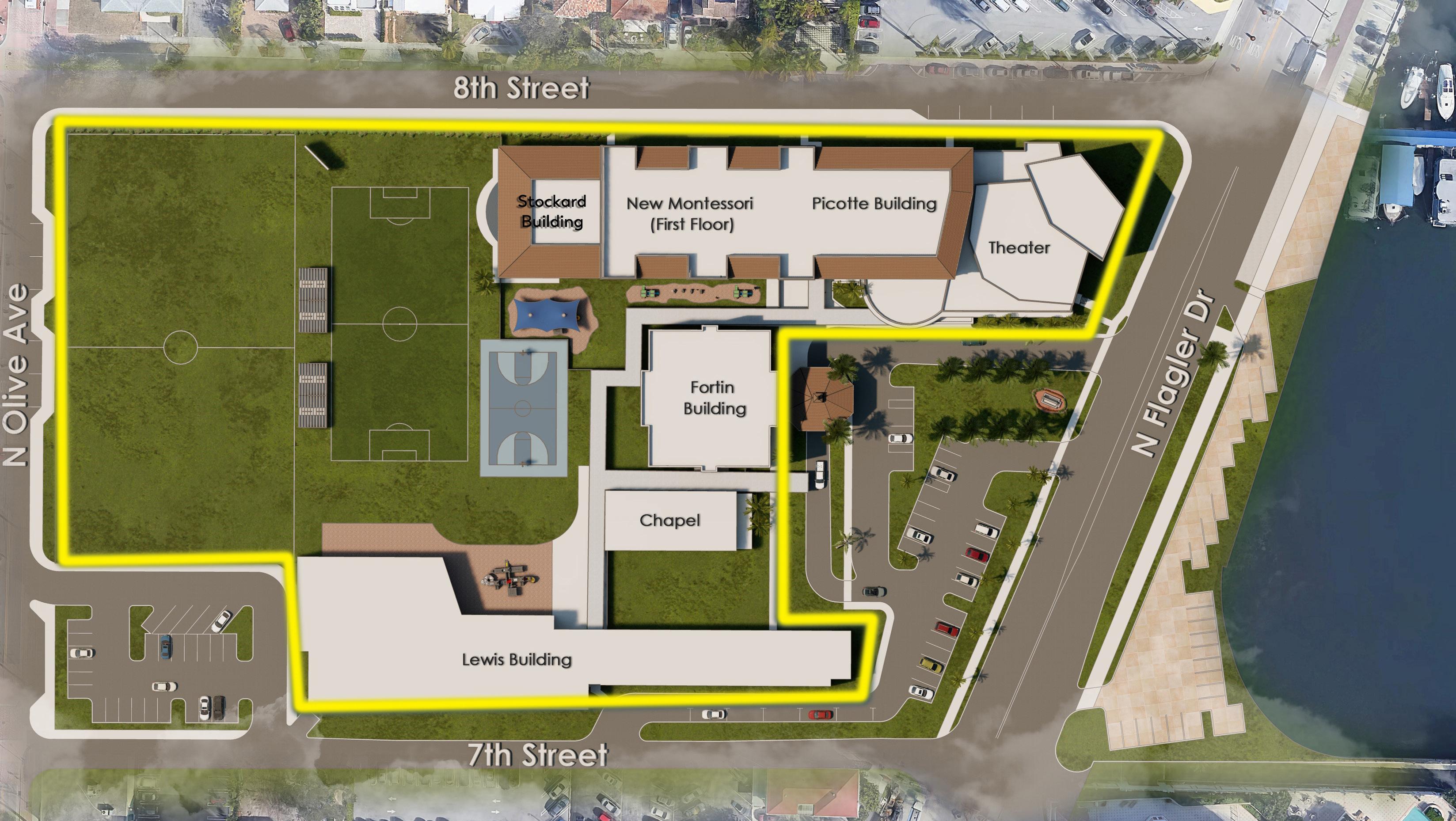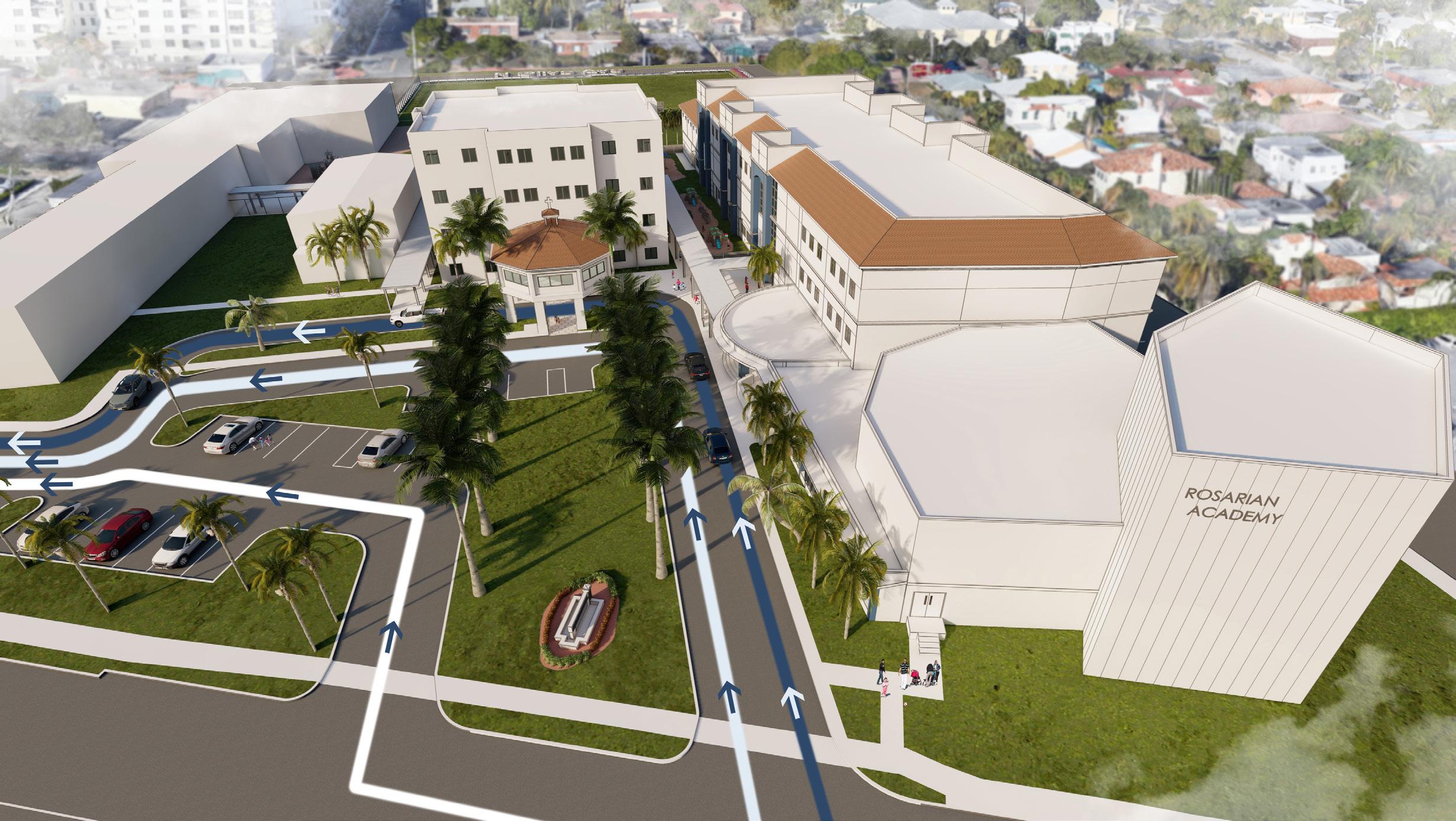 Answer - Rosarian Academy has split its expansion into two phases. In Phase 1, the school plans to enclose the current employee garage and construct a ten-classroom (7 Early Childhood and 3 Kindergarten) Montessori Center with flex space, new adjacent playgrounds, and a Director’s office. The vacated kindergarten and Toddler House classrooms in the Lewis building will become first grade classrooms, which will make ample classroom space for three homerooms in grades two through four. In phase two, the school plans to: reconfigure the front hardscape, which will add parking and more traffic lanes to be used for pickup and dropoff, erect three new canopy-covered walkways connecting campus from Lewis Hall to the Stockard & Picotte buildings, renovate and transform the vacated Children’s House classrooms in Lewis into a spacious aftercare room, and raze the current buildings along Olive Avenue (800, 804, 808, and 810 N. Olive Ave.) and replace them with a new employee parking lot and regulation field with stands and a scoreboard so all practices and games will take place at Rosarian Academy. The new field will allow for lower school intramurals and more athletic opportunities on the existing Smith Moore Pracitce Field. With both phases complete, Rosarian’s campus will be securely enclosed within one contiguous city block with all traffic and parking located outside of all fences.