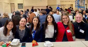 Our Model United Nations team participated in the 32nd annual SOCOMUN conference as the only all-girls team. Paige Sorensen ’24, Isabella Corte ’24, Matilda Geronimo ’24, and Sophia Baaklini ’24 represented the country of Indonesia on topics such as Human Trafficking and Migrant Smuggling; Crime Prevention and Criminal Justice using access to education in prisons; Terrorism with the focus on countering violent extremism; and Cyber SecurityCyberbullying. Our co-presidents, Tahlia Jain ’26 and Megan Martinez ’24, had the opportunity to be co-chairs on two additional committees.