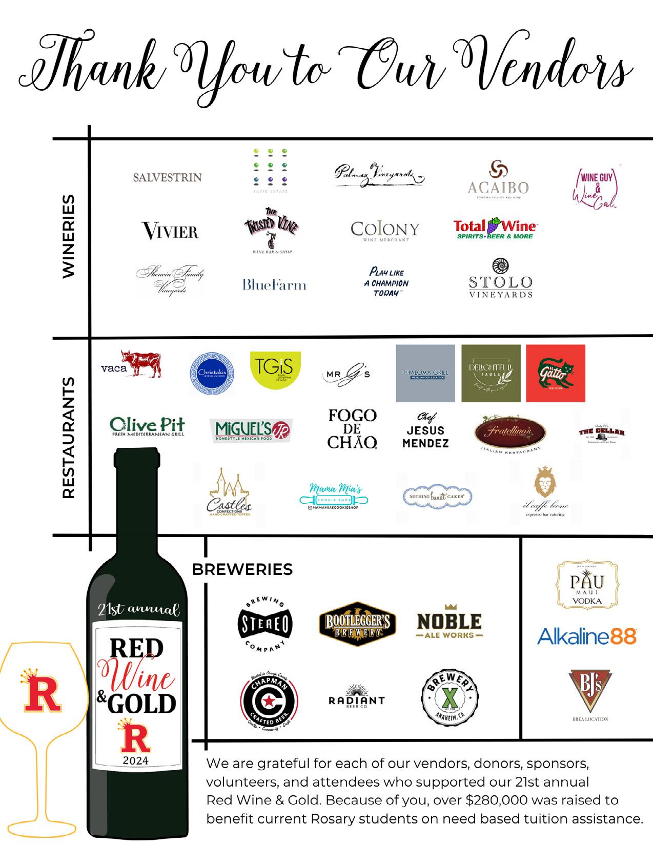We are grateful for each of our vendors, donors, sponsors, volunteers, and attendees who supported our 21st annual Red Wine & Gold. Because of you, over $280,000 was raised to benefit current Rosary students on need-based tuition assistance.