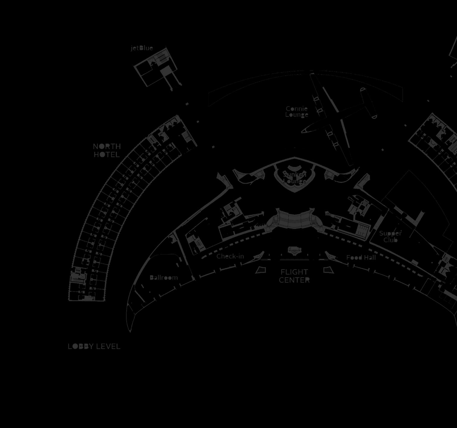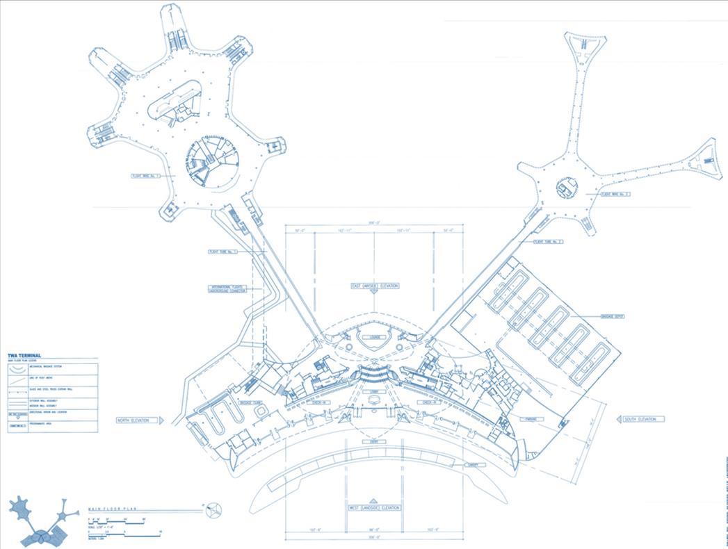 La distribución arquitectónica del TWA Flight Center de Eero Saarinen refleja su enfoque de arquitectura expresiva y funcional.