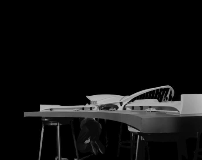 B. Concha central: La estructura central en forma de bóveda o "concha" alberga las áreas de registro y espera Esta área sigue un diseño fluido con curvas continuas, eliminando esquinas y creando una sensación envolvente y aerodinámica.