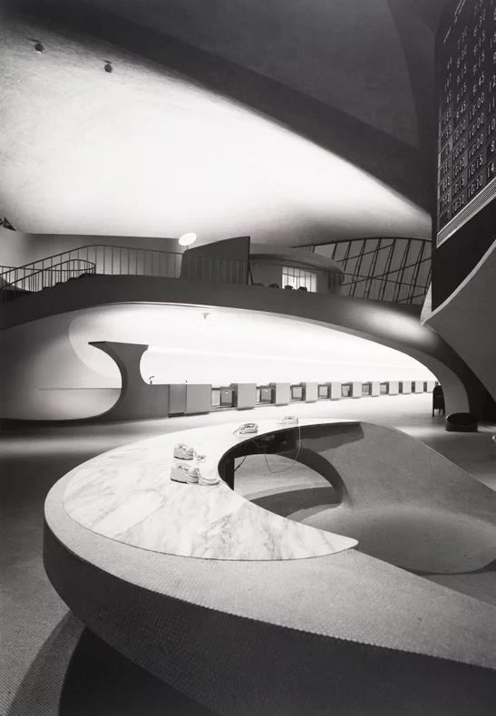 E. Muebles integrados: Saarinen diseñó mobiliario personalizado, como asientos curvos y mostradores, integrados al diseño general del edificio, destacando en especial su icónica Silla Tulipán, que se empleó en los espacios de espera.