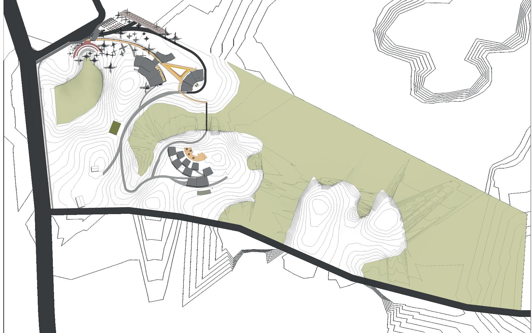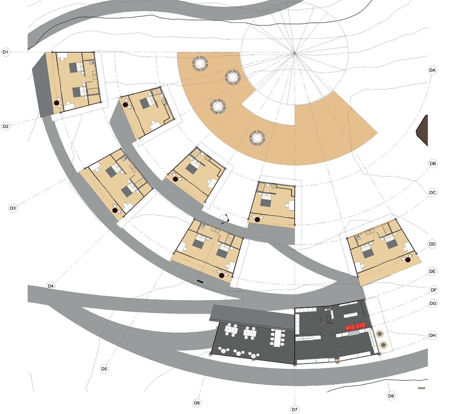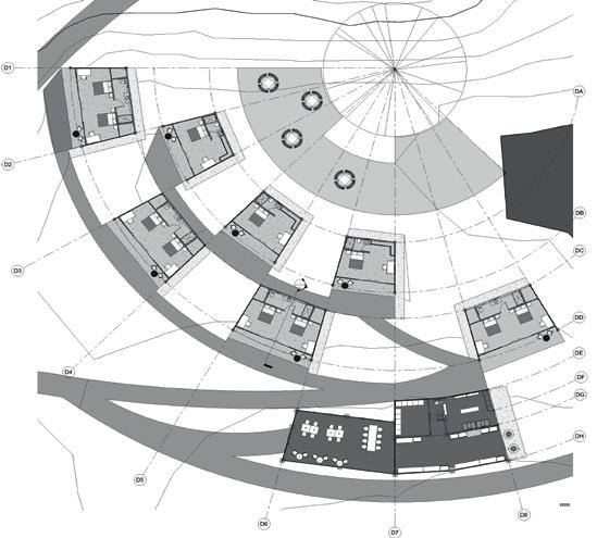 Edificios curveados para aprovechamiento devientos dominantes y luz natural en varias direcciones, además todos los espacios dan a una fachada, lo que permite las aperturas directas al exterior. Los espacios que dan al sur, están cercanos a zonas montañosas o pendientes que las cubren para amortiguar el asoleamiento