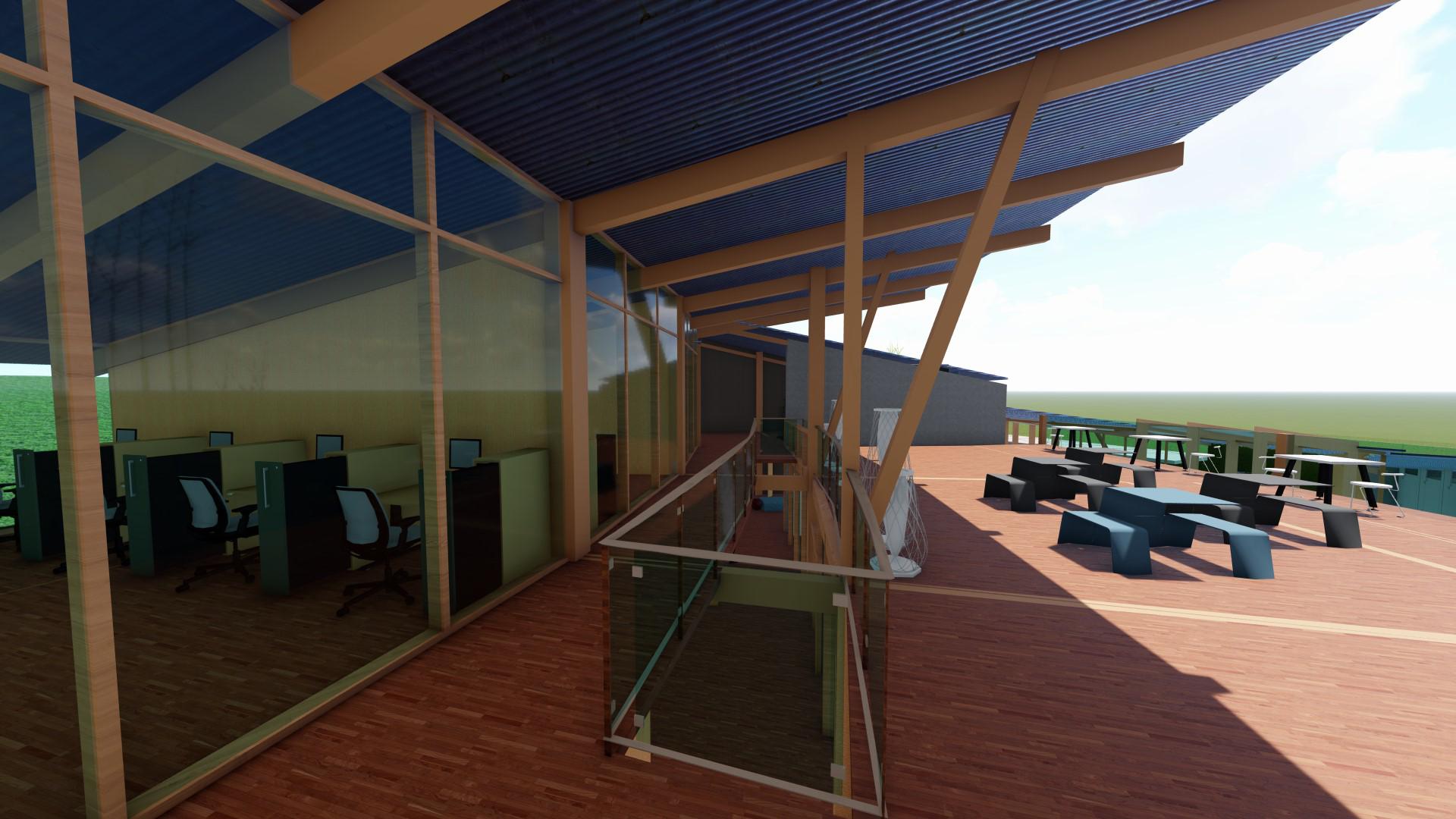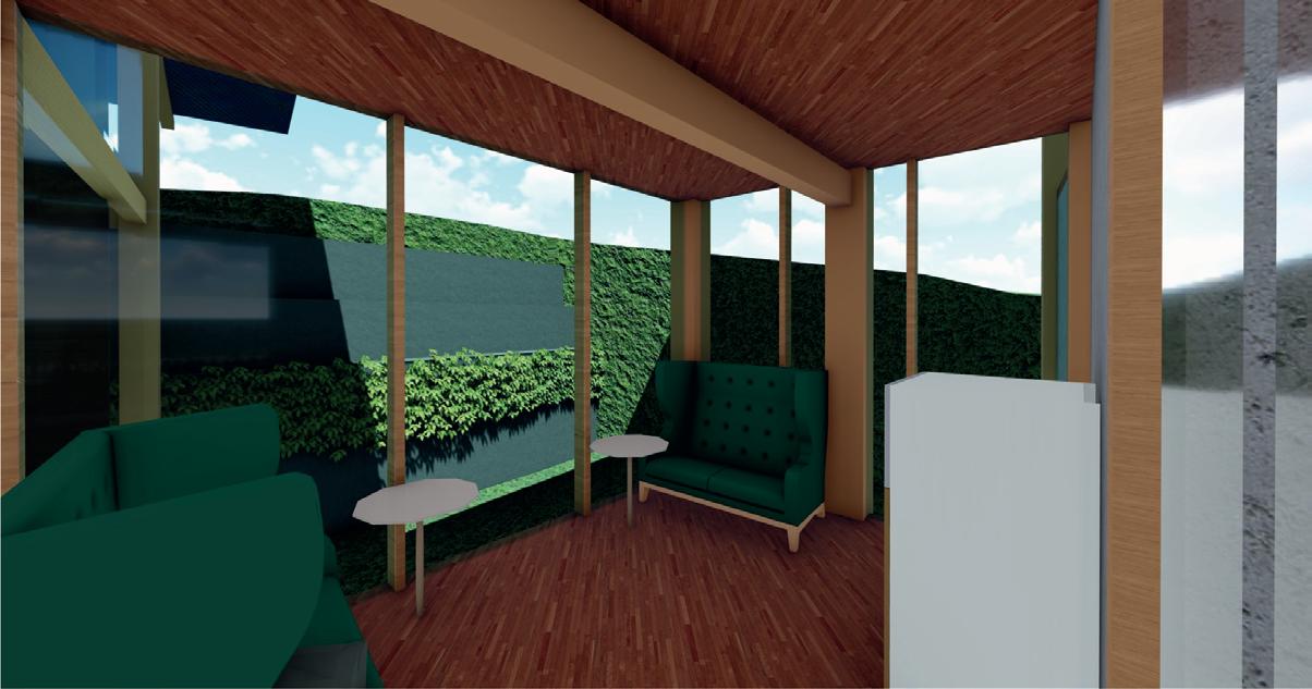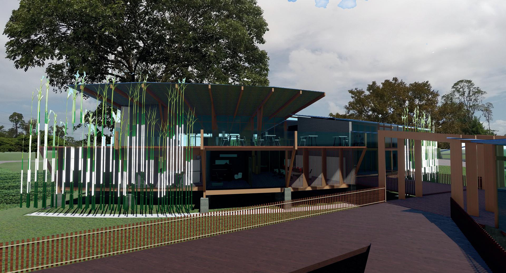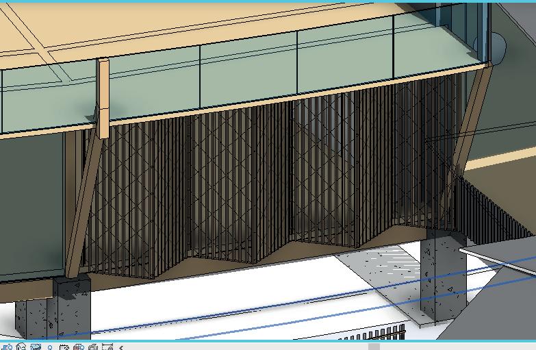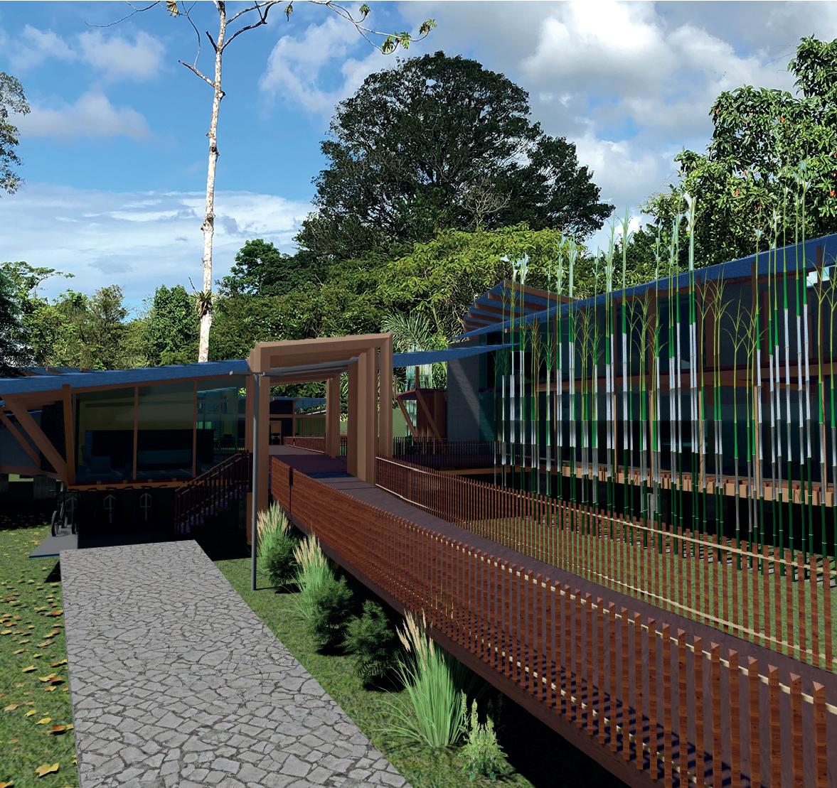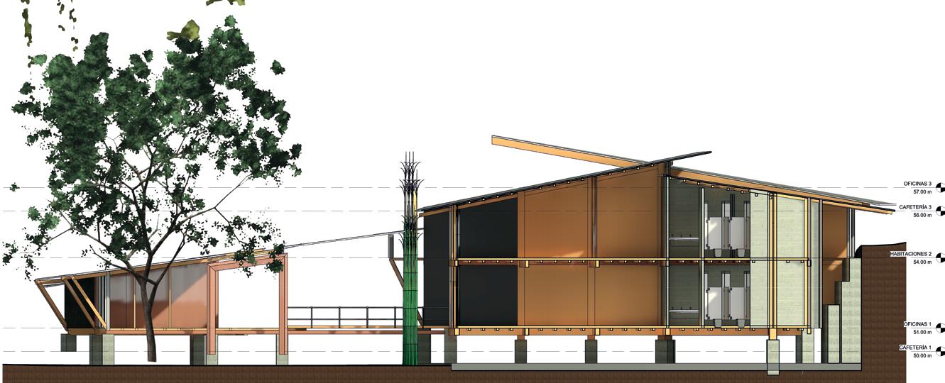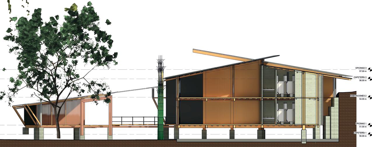 Barrera cortra vientos en Bamboo, al estar dirigida al noreste se usa como doble fachada para proteger del lluvias y ocultar bajantes de cadena propuesto, así como lasu aporte a los drenajes sustentables