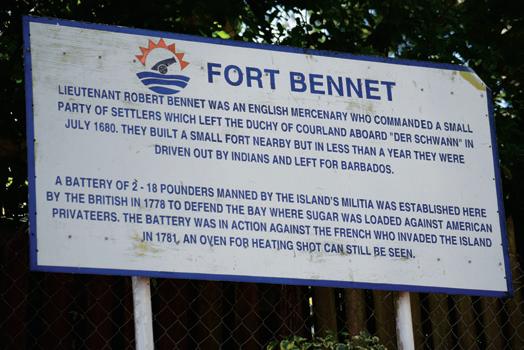 Overlooking Stonehaven Bay, Fort Bennett was named after Lieutenant Robert Bennet who was an English Mercenary who commanded a small party of settlers which left the Duchy of Courland aboard “Der Schwann” in July 1680. The settlers built a small fort nearby but, in less than a year, they left for Barbados after being driven out by Native Indians.