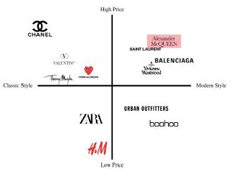 Avtandil's main competitors are other Georgian brands proposing a similar aesthetic through their fashion for a lower price or that brands are already implemented and established in the UK. Anouki could be described as the latter as the brand has a strong presence in the UK's online retail spaces (FarFetch, Moda Operanti) and is already established as a Georgian minimalist brand offering lower prices to Avtandil. Lado Bokuchava, another Georgian brand with a very minimalist basic wear fashion similar to Avtandil's latest collection is also present in online retail spaces (Net-à-Porter, Yoox). An established international brand which could also be considered a direct competitor to Avtandil is Jil Sander which proposes the same aesthetic for the similar prices (£500 - £3000). Therefore, Avtandil positions itself as a high-priced unfamiliar brand as it is quite unknown internationally as a whole which can be a weakness compared to its competitors.