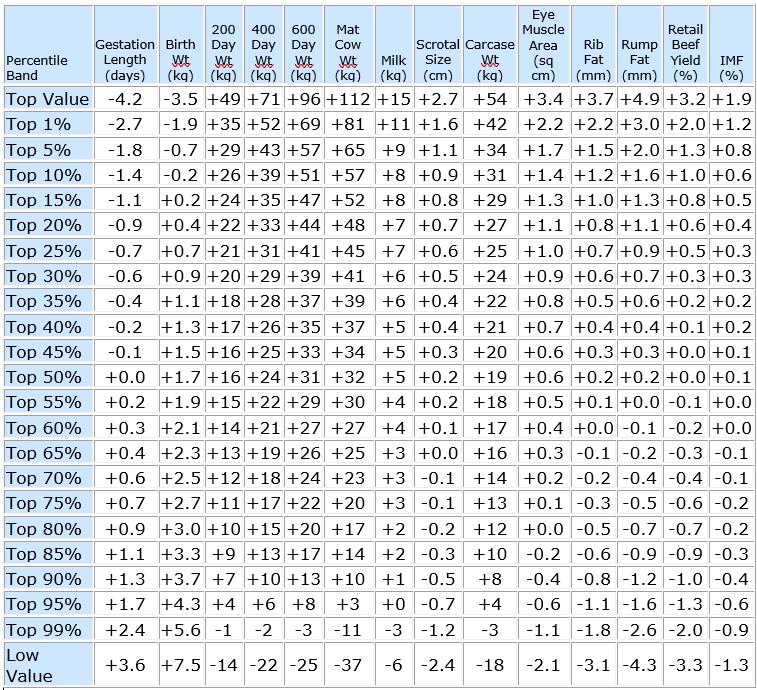 Use this table as a guide to compare individual animals with the current genetic level of the