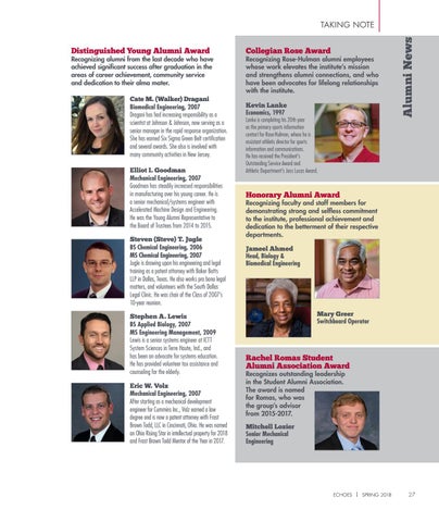 Recognizing alumni from the last decade who have achieved significant success after graduation in the areas of career achievement, community service and dedication to their alma mater. Cate M. (Walker) Dragani Biomedical Engineering, 2007 Dragani has had increasing responsibility as a scientist at Johnson & Johnson, now serving as a senior manager in the rapid response organization. She has earned Six Sigma Green Belt certification and several awards. She also is involved with many community activities in New Jersey. Elliot I. Goodman Mechanical Engineering, 2007 Goodman has steadily increased responsibilities in manufacturing over his young career. He is a senior mechanical/systems engineer with Accelerated Machine Design and Engineering. He was the Young Alumni Representative to the Board of Trustees from 2014 to 2015. Steven (Steve) T. Jugle BS Chemical Engineering, 2006 MS Chemical Engineering, 2007 Jugle is drawing upon his engineering and legal training as a patent attorney with Baker Botts LLP in Dallas, Texas. He also works pro bono legal matters, and volunteers with the South Dallas Legal Clinic. He was chair of the Class of 2007’s 10-year reunion. Stephen A. Lewis BS Applied Biology, 2007 MS Engineering Management, 2009 Lewis is a senior systems engineer at ICTT System Sciences in Terre Haute, Ind., and has been an advocate for systems education. He has provided volunteer tax assistance and counseling for the elderly. Eric W. Volz Mechanical Engineering, 2007 After starting as a mechanical development engineer for Cummins Inc., Volz earned a law degree and is now a patent attorney with Frost Brown Todd, LLC in Cincinnati, Ohio. He was named an Ohio Rising Star in intellectual property for 2018 and Frost Brown Todd Mentor of the Year in 2017.