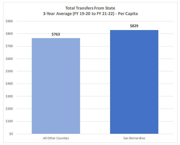 The Blue Sky report shows that San Bernardino County receives more overall state funding per capita than the average California county. Over the past three fiscal years, the county received $829 in state funding per capita, compared to a statewide average of $763 for other California counties - a 9% advantage. These amounts include funding from all state sources, including Realignment, Prop 172, MHSA, and other state transfers to counties, but do not include funding for capital projects and federal projects. Also, the statewide average is a population-weighted average across the 57 counties in California excluding San Bernardino.