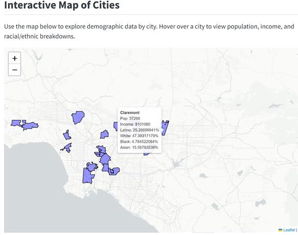 As part of the broader DataHub, we are developing the City Data Project, a new large-scale database that aggregates and presents city-level information regarding community demographics, voting, governance, fiscal health, economics, public safety, infrastructure, the environment, and more. We are presently limiting our scope to cities in four Southern California counties (LA, Orange, San Bernardino, and Riverside). The City Data Project will emphasize accessibility and usability through interactive data visualizations, tools, and applications, while offering open access to researchers for further explorations.
