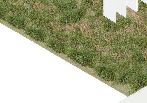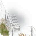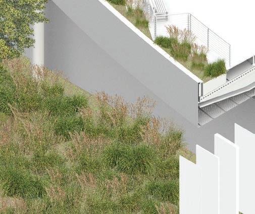 The Lawrence River Station harmonizes three distinct elements: the train station and café, the protective canopy, and the surrounding park. At ground level, the station and café nestle beneath an expansive canopy that shelters the entire complex. Visitors are naturally drawn to the entrance through generous glazing that distinguishes public areas from private spaces, which are discreetly clad in dark aluminum panels. The entrance features outward-angled stairs that extend toward the street, creating an intuitive and welcoming pathway. Strategic vegetation further defines the entry points and guides visitors’ movement. By deliberately separating the buildings from the soaring canopy overhead, the design emphasizes the canopy’s commanding presence while creating a simultaneous sense of openness and protection from the elements.