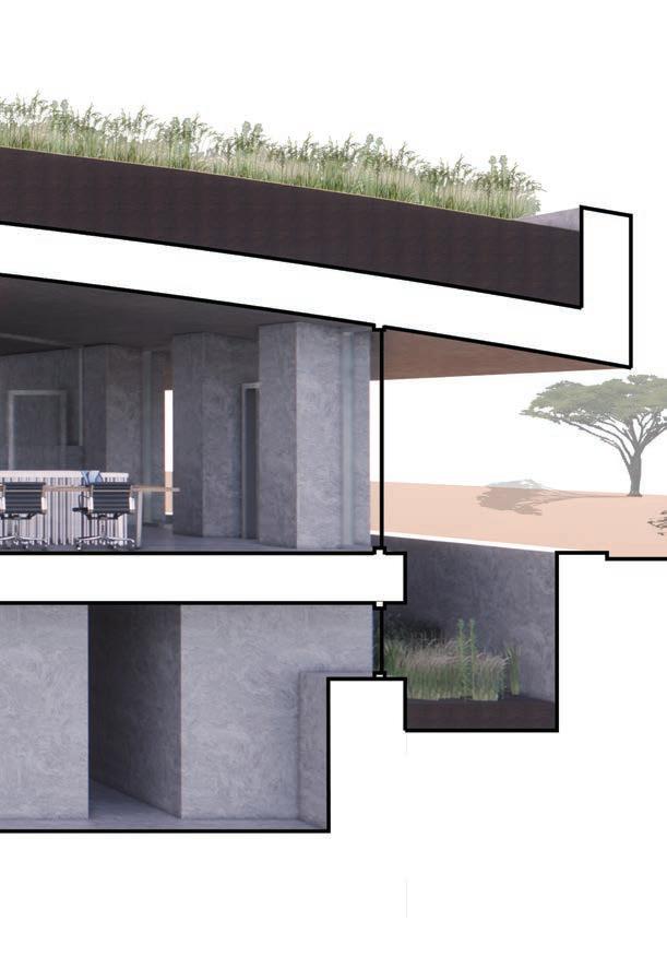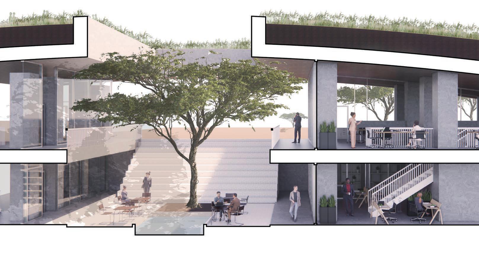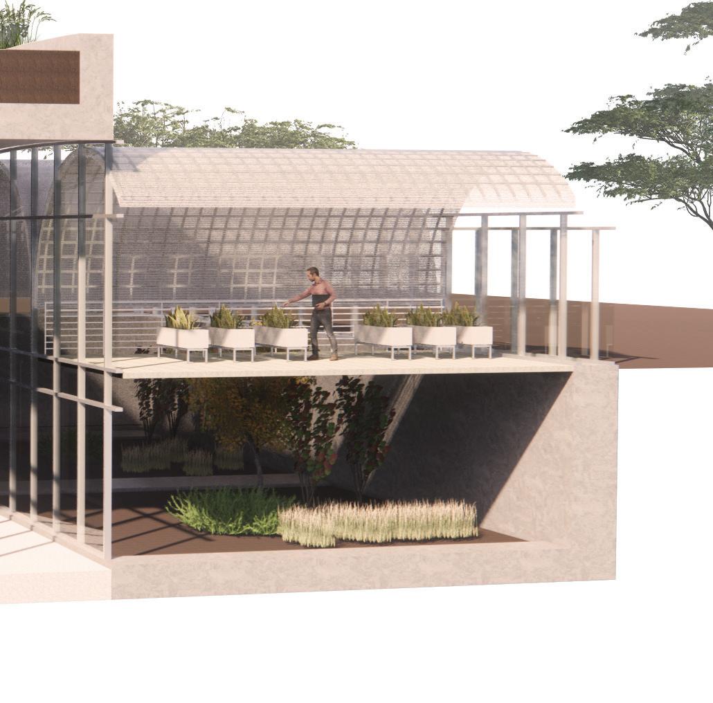 The proposed innovation and research center expands the Ceraas Agricultural Campus in Senegal with climate-responsive design at its core. Passive strategies permeate every aspect of the architecture. Substantial thermal mass walls resist heat infiltration, while a concrete roof with deep overhangs incorporates native plantings in an integrated green roof system. By nestling the structure into the landscape, the building minimizes surface area exposed to the region’s intense sun and heavy rainfall. Maintaining a single-story profile above grade while extending below ground creates a naturally shaded sunken courtyard and underground research facilities. Strategic trees in the courtyard provide additional shade precisely where the sun’s angle would otherwise penetrate interior spaces. Through the thoughtful combination of concrete thermal mass, earth integration, and careful orientation, the center maintains comfortable conditions throughout all its spaces regardless of external conditions.