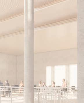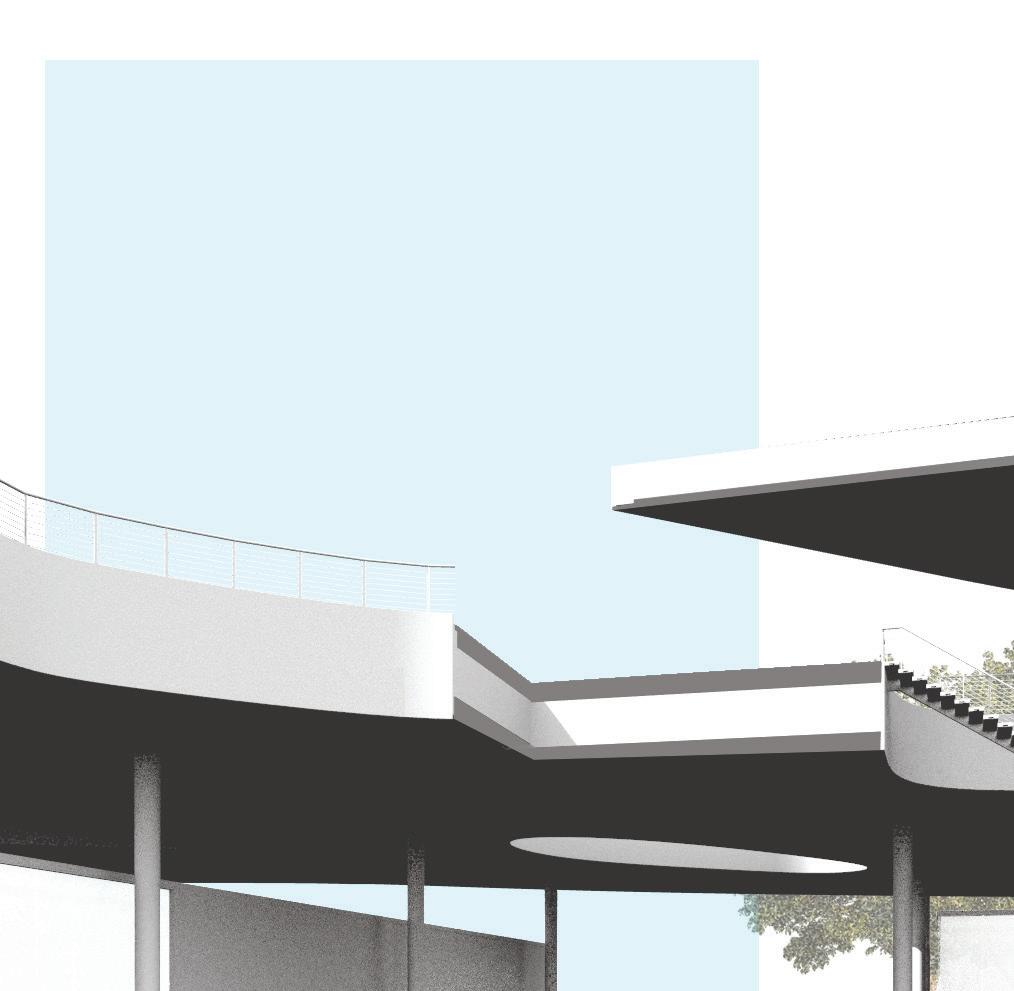 The Black Box is embedded into the ground, creating a protected and adaptable performance environment. In contrast, the White Box is elevated, making it a visible beacon from both the entrance and the park. While the Black Box retains a traditional, flexible performance setting, the White Box expands theatrically, its third-floor program wrapping the edges like a catwalk. The building’s elevations frame the White Box like a proscenium, with solid corner supports anchoring the structure. A sun screen drapes the facade, evoking the curtain of a classic theater, reinforcing the building’s role as both a stage and a performance itself.