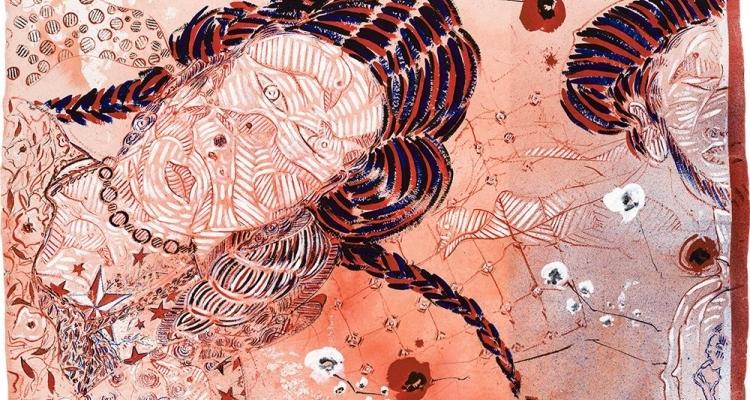Dans un espace contigu, les Colossal Head de 2006, la sculpture Belthead I de 1998, son magnifique Big Tangle Suite de 2009 (avec ses formes, ses couleurs et ses motifs associés dans une danse virevoltante) et ses Body Politic des années 80, de petites armures en tissu métallique figurant des corps absents, évaporés ou peut-être décimés. Elles côtoient trois de ses six grands dessins roses de 2010 dans lesquels on retrouve son usage des tampons, son vocabulaire poétique aux motifs floraux et une figuration à la fois intime et de grand déploiement. Des oeuvres splendides dont un exemplaire a été acquis par la Caisse de dépôt et placement du Québec.