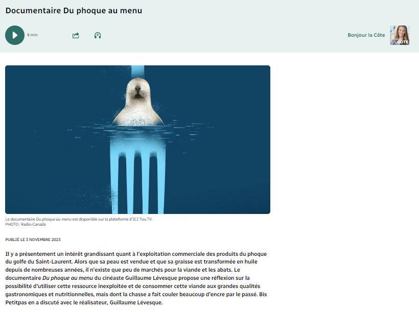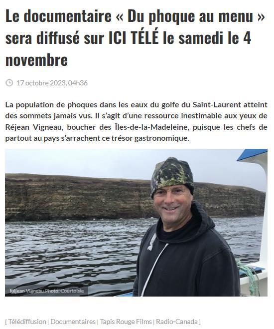 « Du phoque au menu » est un documentaire de Guillaume Levesque produit par Tapis rouge films. Il sera diffusé le 4 novembre à 22h30 sur ICI Radio-Canada Télé et sur ICI TOU.TV .