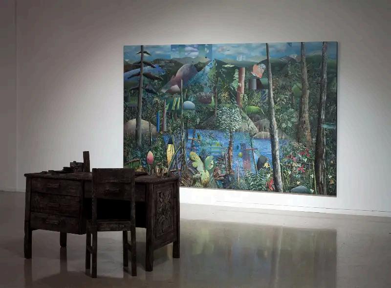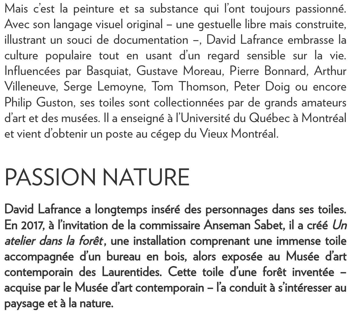 David Lafrance a longtemps inséré des personnages dans ses toiles. En 2017, à l’invitation de la commissaire Aseman Sabet, il a créé Un atelier dans la forêt, une installation comprenant une immense toile accompagnée d’un bureau en bois, alors