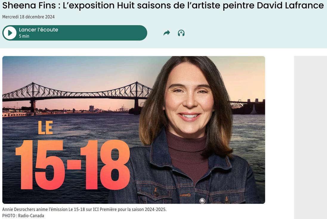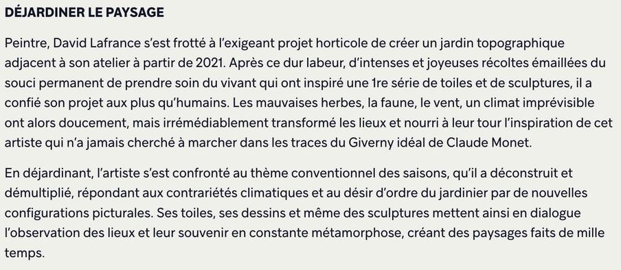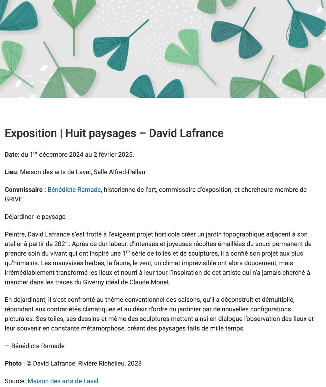 David Lafrance exposera ensuite en solo à la salle Alfred-Pellan de la Maison des arts de Laval du 1er décembre au 2 février, à l’invitation de sa directrice, Jasmine Colizza.