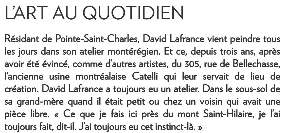 Résidant de Pointe-Saint-Charles, David Lafrance vient peindre tous les jours dans son atelier montérégien. Et ce, depuis trois ans, après avoir été évincé, comme d’autres artistes, du 305, rue de Bellechasse, l’ancienne usine montréalaise Catelli qui leur ser vait de lieu de création. David Lafrance a toujours eu un atelier. Dans le sous-sol de sa grand-mère quand il était petit ou chez un voisin qui avait une pièce libre. « Ce que je fais ici près du mont Saint-Hilaire, je l’ai toujours fait, dit-il. J’ai toujours eu cet instinct-là. »